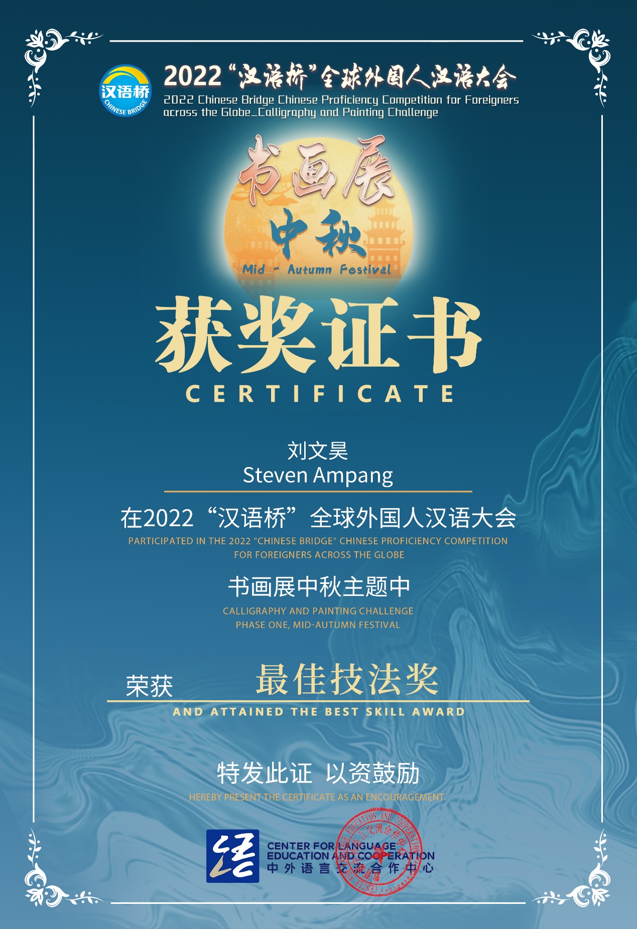 2022年9月20日,由教育部中外语言交流合作中心主办,中文联盟、中国日报联合承办,汉语桥俱乐部协办的2022“汉语桥”全球外国人汉语大会书画展——中秋比赛结果公布。学校印度尼西亚籍2022级汉语国际教育专业硕士研究生刘文昊(原名:刘文才,STEVEN AMPANG)斩获“最佳技法奖”。