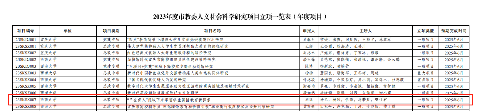 近日,重庆市教育委员会公布了关于2023年度市教委人文社会科学研究项目立项通知,公司党委书记刘猛主持的思政专项“‘三全育人’视域下来华职工国情教育新探索”项目获批立项。