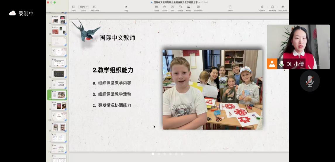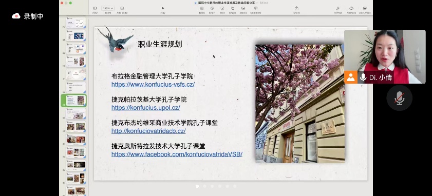 2023年3月17日,“缙云知华”大讲坛第十七期学术沙龙通过腾讯会议的形式在线上成功举办。讲座以“国际中文教师的职业生涯发展及教学经验分享”为主题,邀请学院优秀员工、捷克布拉格金融管理大学孔子学院文化协调员兼汉语教师、《欧洲时报》捷克办事处主任和布拉格泓蒙汉学堂副董事长狄小倩老师为主讲人,学院汉教系主任杨甜老师及汉语国际教育硕士研究生聆听讲座。
