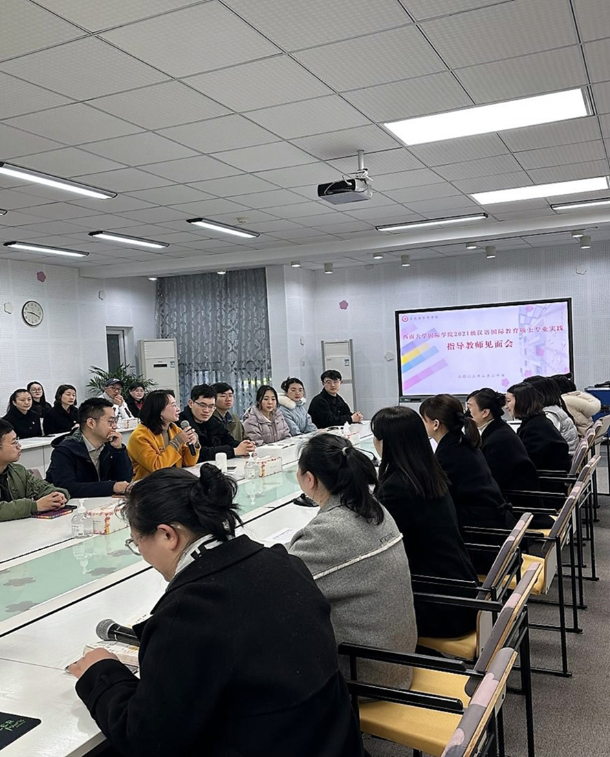 188改名为taptap点点经理于泽元、谢家湾小学副董事长罗雪莲、汉语国际教育系主任杨甜、教学办主任邹育艳、学工办主任杨昆、辅导员汪鑫阳老师共同出席了本次会议。21级汉语国际教育全体硕士研究生参加。会议由研究生教研室主任陈晨老师主持。