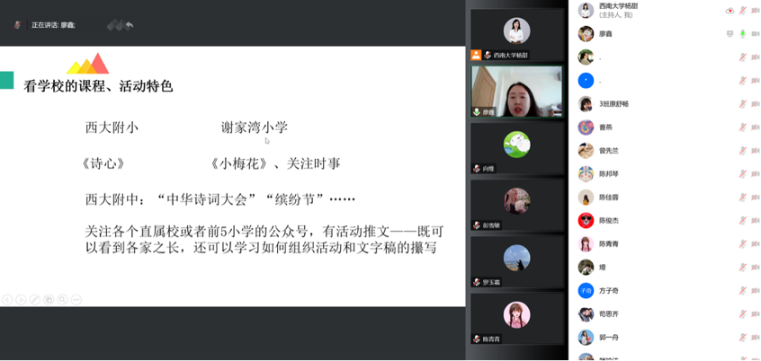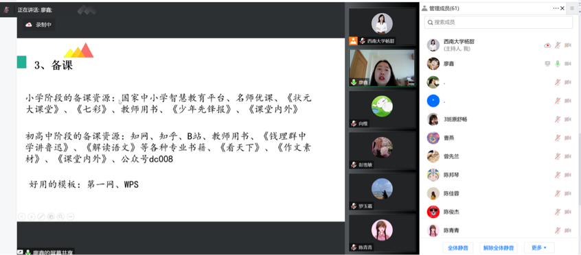 2023年1月3日上午10时,“缙云知华”大讲坛学术沙龙第十五期通过腾讯会议举办,该讲座聚焦专业实践,主题为“实习中那些你不知道的秘密”。学校附属中学语文高级教师廖鑫受邀主讲,学院汉教系主任杨甜主持讲座,70余名硕士生在线学习。