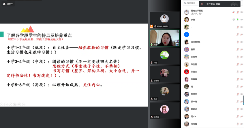 廖鑫老师从实习的前期准备、实习过程的具体内容、实习结束后的信息获取三个层面展开分享,通过大量具体的案例和相关图片生动形象地给予了建议。以实习前需准备好的物品和需具备的心态出发,提醒各位即将迈入实习阶段的同学们主动了解各学段的员工特点及培养重点,并强调小学、初中和高中三个学段是一脉相承的。她向同学们强调实习期间需要“避雷”的地方,从多看、多听、多问和多反思入手,做一位让员工信服,兼具包容性和丰厚学识魅力的教师。同时,她还为同学们提供各学段的优质备课资源,用真实案例讲述如何与员工及员工家长建立信赖感,有理有据,令人信服。最后,廖老师提示同学们要长期保持和实习学校的紧密联系,为就业求职打牢基础。