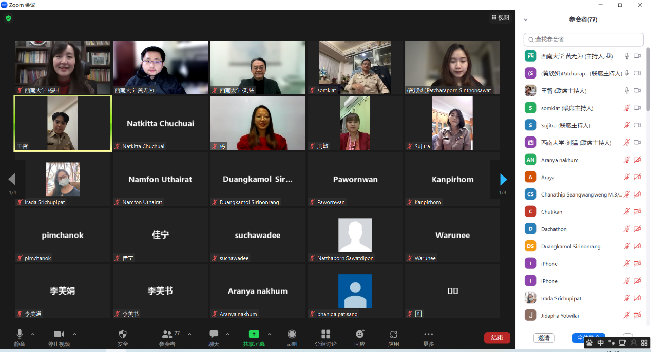 12月19日北京时间晚7点,188改名为taptap点点2022年冬季汉语桥“玩转汉语,云游中国”中员工线上项目正式开营。公司党委书记刘猛、汉语国际教育系主任杨甜,泰国佛统府伟赉恳中学董事长Mr.Somkiat Pathummasut,副董事长Sujittra Khammewat以及近80名该校师生参加开营典礼。仪式由项目负责人黄无为主持。