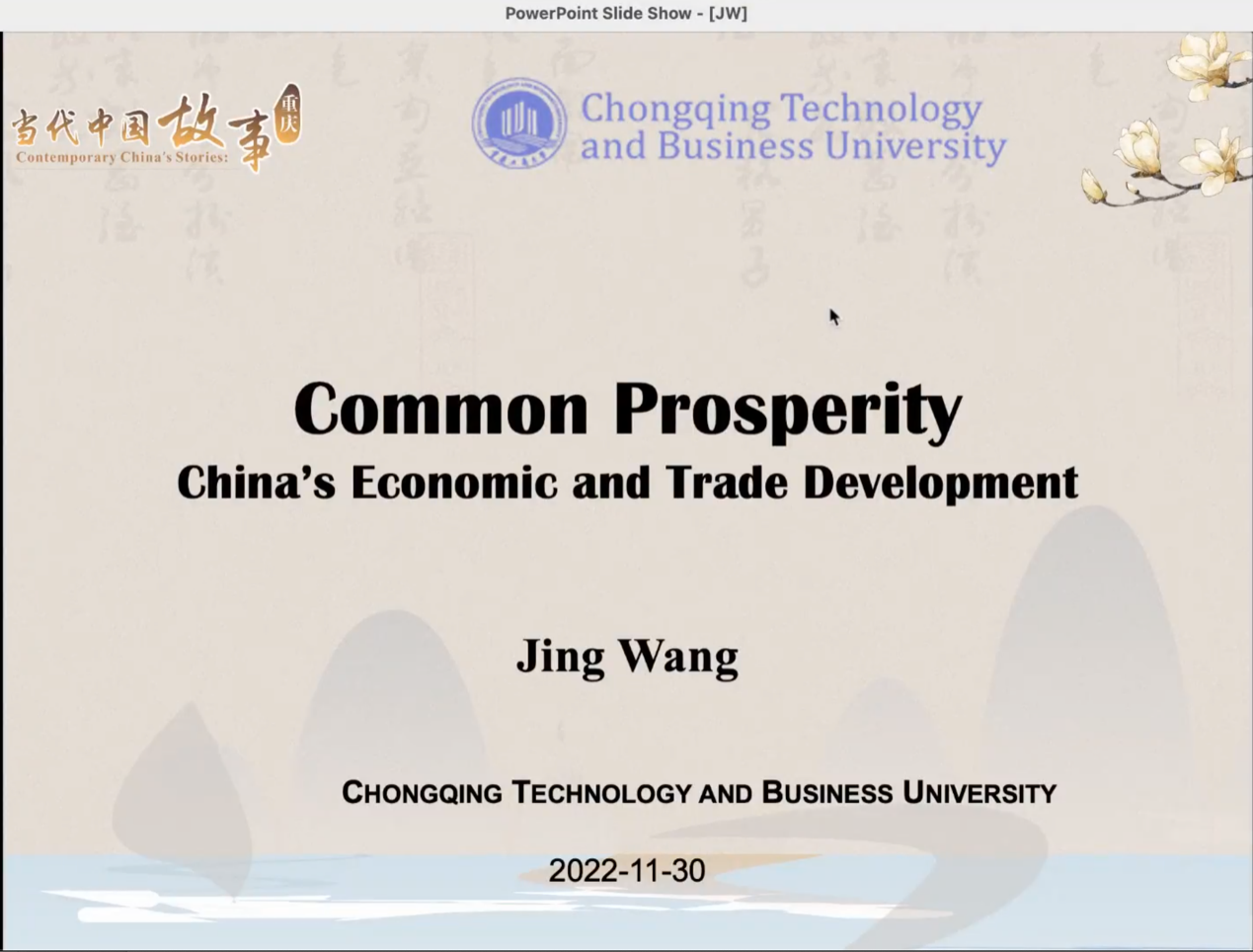 为积极贯彻落实党的二十大关于“向世界讲好中国故事”的号召,2022年11月30日下午3:00,“缙云知华”大讲坛专家讲座第十二期在重庆工商大学成功举办,主题为“共同富裕—中国经济与贸易发展”,讲座由重庆工商大学经济学院王静副教授主讲,国际合作与交流处处长张轶主持。受疫情影响,讲座以线上形式展开,重庆工商大学国际员工和部分中国员工代表、在渝其他高校国际员工通过腾讯会议线上参加讲座。