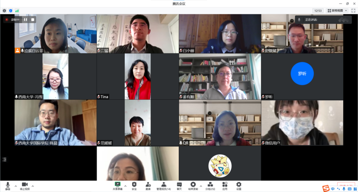 在交流分享环节,王湛明讲述留守校内期间,为了保障职工日常生活,为员工代领餐券、组织核酸检测、处理签证问题、发放生活费等累并快乐着的工作经历。黄无为分享志愿服务期间被通知成为“密接”后的心路历程。杨锐分享居家办公期间每天统计全院教职员工的核酸检测结果、更新学院网站等工作内容。杨昆回忆自己再次入住紫云楼与职工同吃同住的经历。王鹊建议学院统筹全校来华留学工作、突破瓶颈、攻坚克难,继续打造“留学西大”品牌。李航副经理赞扬大家在校内外坚持工作所做出的努力。随后,支部为11月过政治生日的陈雨曦同志送上祝福。