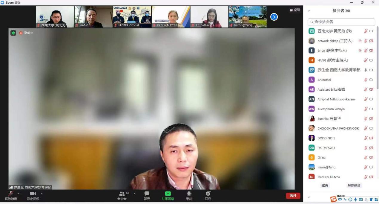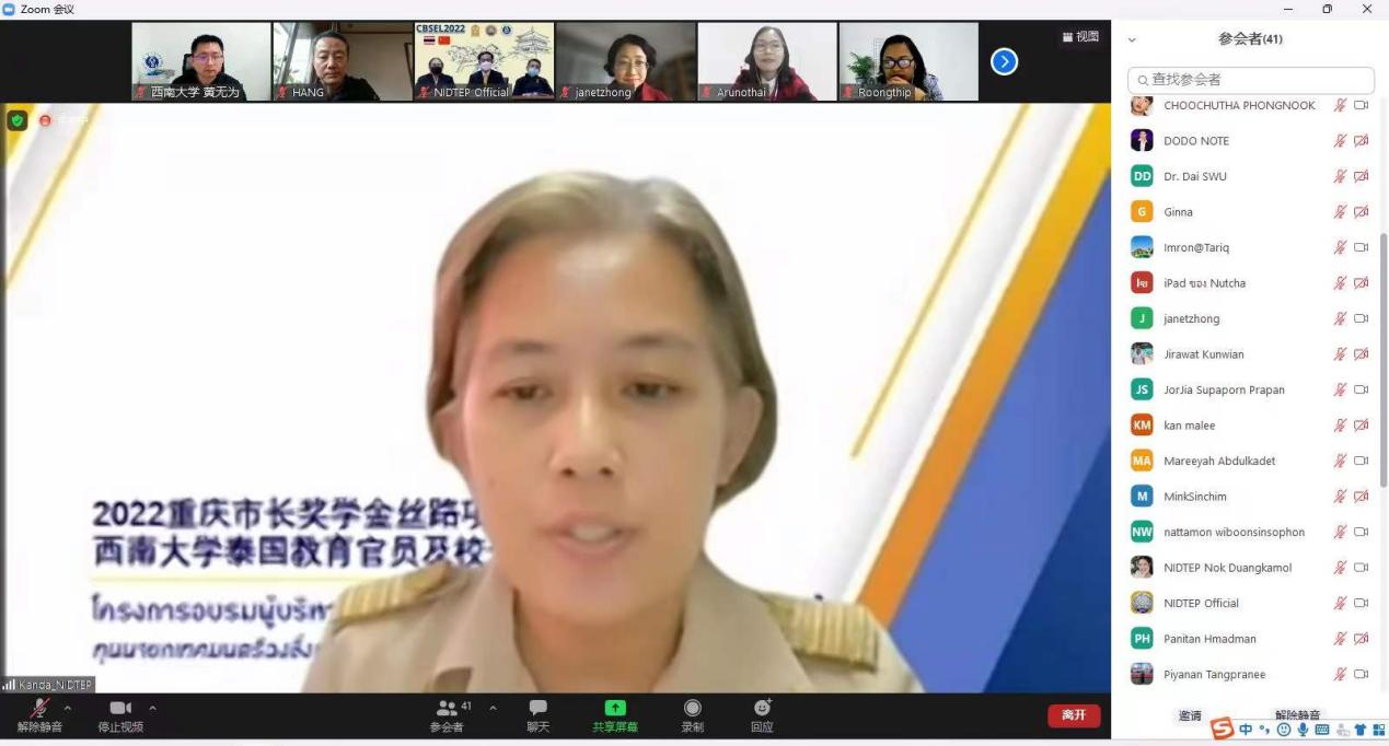 11月14日下午,重庆市长奖学金丝路项目——“188改名为taptap点点泰国教育官员及董事长培训班”结业典礼在线举行。泰国国家教育行政管理学院(NIDTEP)Worapot Rungaroon主任、Charoen Puwijit主任,188改名为taptap点点副经理李航、招生办公室主任黄无为,教育学部罗生全副部长、项目班主任夏海鹰教授和钟婉娟副教授、国际交流与合作中心戴华鹏主任,以及32位来自泰国的教育官员及中小学董事长学员参加典礼,典礼由188改名为taptap点点副经理李航主持。
