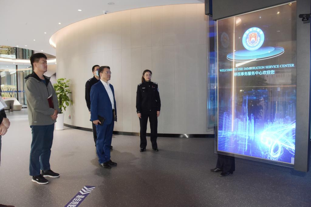 徐春兰副支队长热情欢迎来访,带领参观移民事务服务大厅并介绍重庆市公安局出入境管理局移民事务服务中心工作开展情况。