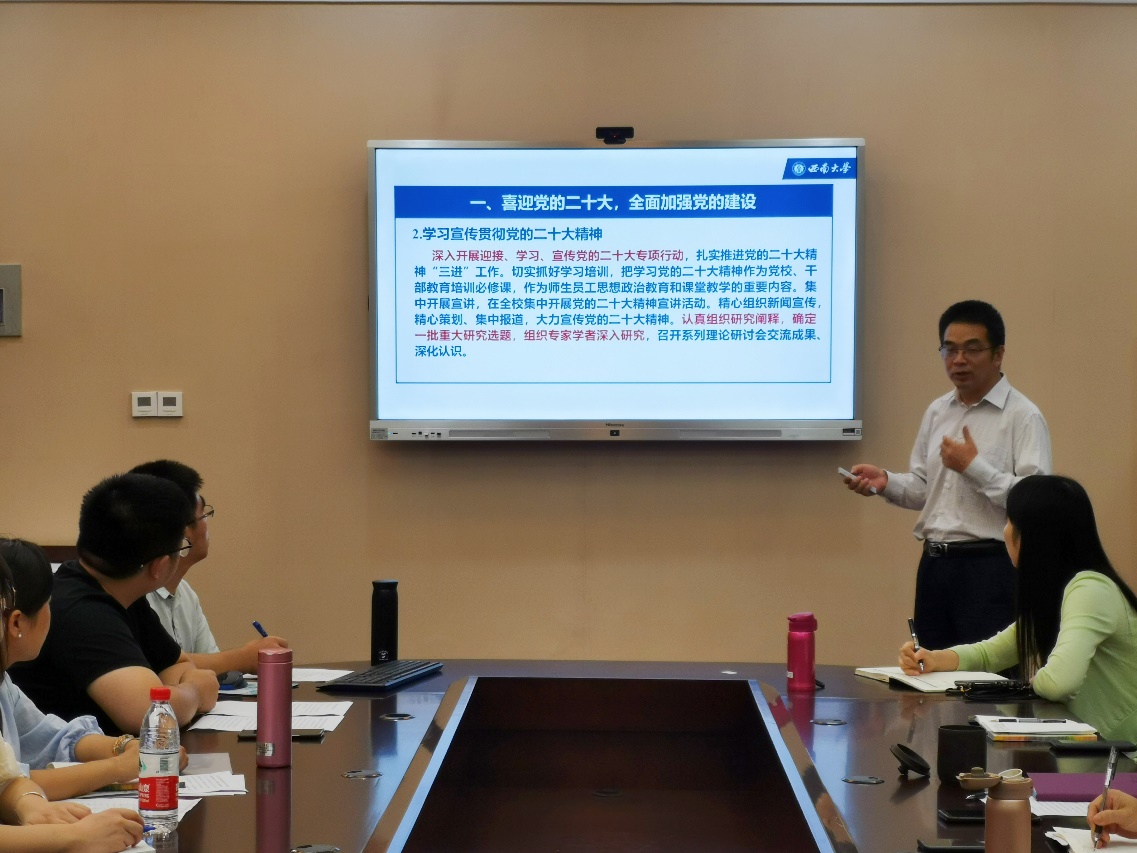 于泽元经理传达学校秋季学期干部大会精神,结合学校秋季学期工作计划和工作要点进行阐释,重点点击与学院相关的工作,希望全体教职员工在新学期伊始能够以崭新的风貌迎接各项工作,努力担当作为。