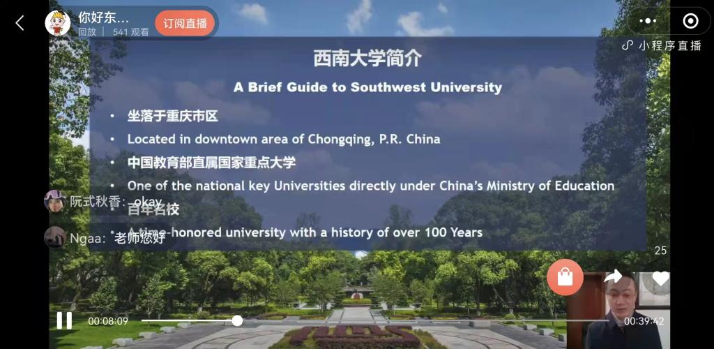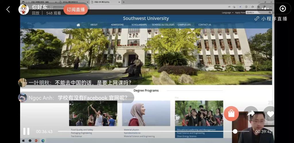 本次说明会首次通过微信平台直播,包括介绍重庆和学校、留学西大整体情况、国际员工收费标准、奖学金申请和问答环节等板块。招办工作人员就学校优势特色学科,如教育学、生命学科群、心理学和经济学以及相关培养单位进行详细介绍,并通过直播弹幕与国际员工进行线上互动,热情而又耐心地解答疑问,说明相关政策与要求,确保宣讲会的质量与实效。