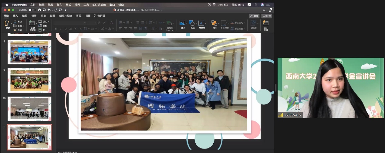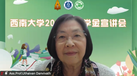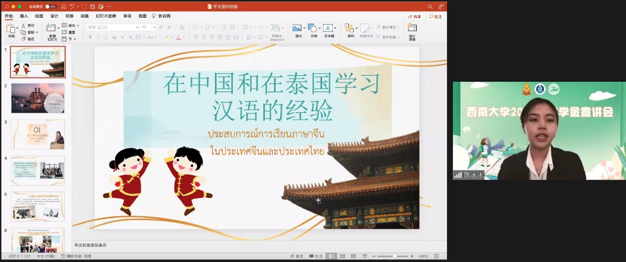 最后,学校在华职工李佩英(Ms. YAOWAPA SANGJAN)结合丰富的视频、图片,生动全面分享了自己在华留学和生活;在泰职工陈冰冰(Ms. CHAYAKAN SAENCHAN)则展示疫情下学校如何帮助大家更好地完成线上学习,开展生涯指导和心理疏导等,消除大家申请留学的疑虑。