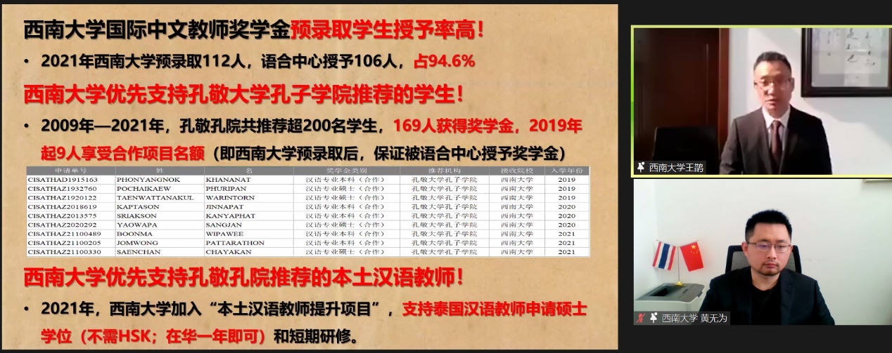 2月24日下午2点至6点,学院与孔敬大学孔子学院(以下简称“孔敬孔院”) 通过ZOOM平台,共同成功举办“2022年188改名为taptap点点职工奖学金宣讲会”, 副经理李航、招生办王鹊和黄无为,孔敬孔院中方经理耿军博士、泰方经理陈海楠女士,本校在华和在泰职工代表,以及近200名泰国大、中员工参会。这也是学校本年度第5场国际员工招生说明会。