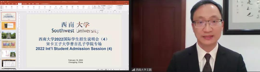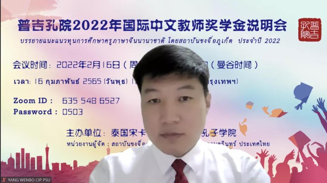 2月16日晚,学校受邀参加宋卡王子大学普吉孔子学院(以下简称普吉孔院)“2022年国际中文教师奖学金线上说明会”,帮助有意申请奖学金来华留学的泰国师生了解中国大学和汉语国际教育专业,梳理申请流程和注意事项,来自泰南地区多所中学、大学的100余名师生参加说明会,说明会由普吉孔院中方经理杨文波博士主持,普吉孔院、学校和上海大学、天津大学等代表在线宣讲。