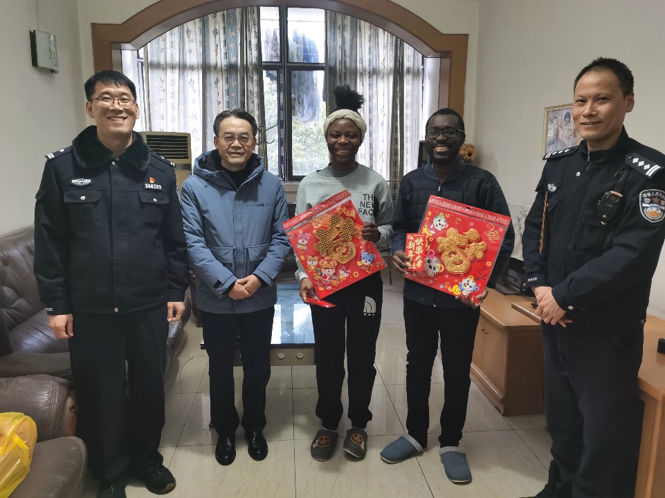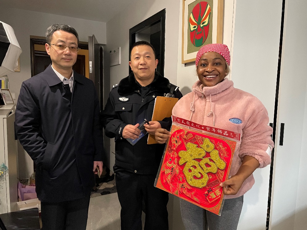 慰问采取学院领导、出入境民警、辖区民警、社区干部四位一体联动方式,学院领导及相关工作人员分成5组,与出入境民警、天生派出所、朝阳派出所民警,奔月路社区干部一起,逐一看望住在朝阳、天生、北温泉辖区的国际员工,询问他们的学习、生活情况,嘱咐他们加强防护,多与家人联系。鼓励他们合理利用时间认真学习,取得更好的成绩。学院领导为国际员工送上福字和精美的新年贺卡,祝福他们在新的一年不断进步,在学业上更上一层楼。