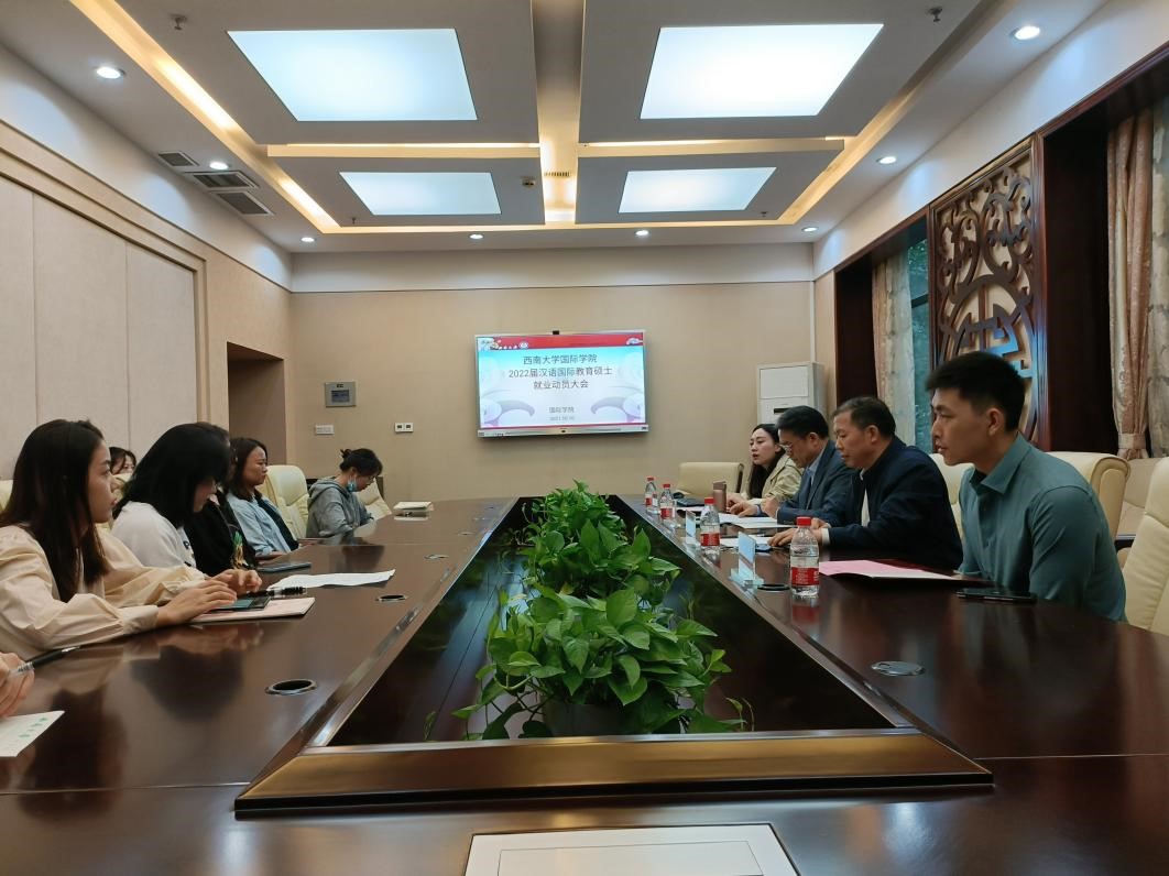 2021年10月10日下午3点,学院2022届汉语国际教育硕士毕业生就业动员大会在紫云楼签约室举行。刘猛书记、刘承宇经理、2021届优秀毕业生代表陈贤德及2019级全体汉语国际教育硕士研究生参加会议,会议由研究生辅导员汪鑫阳主持。