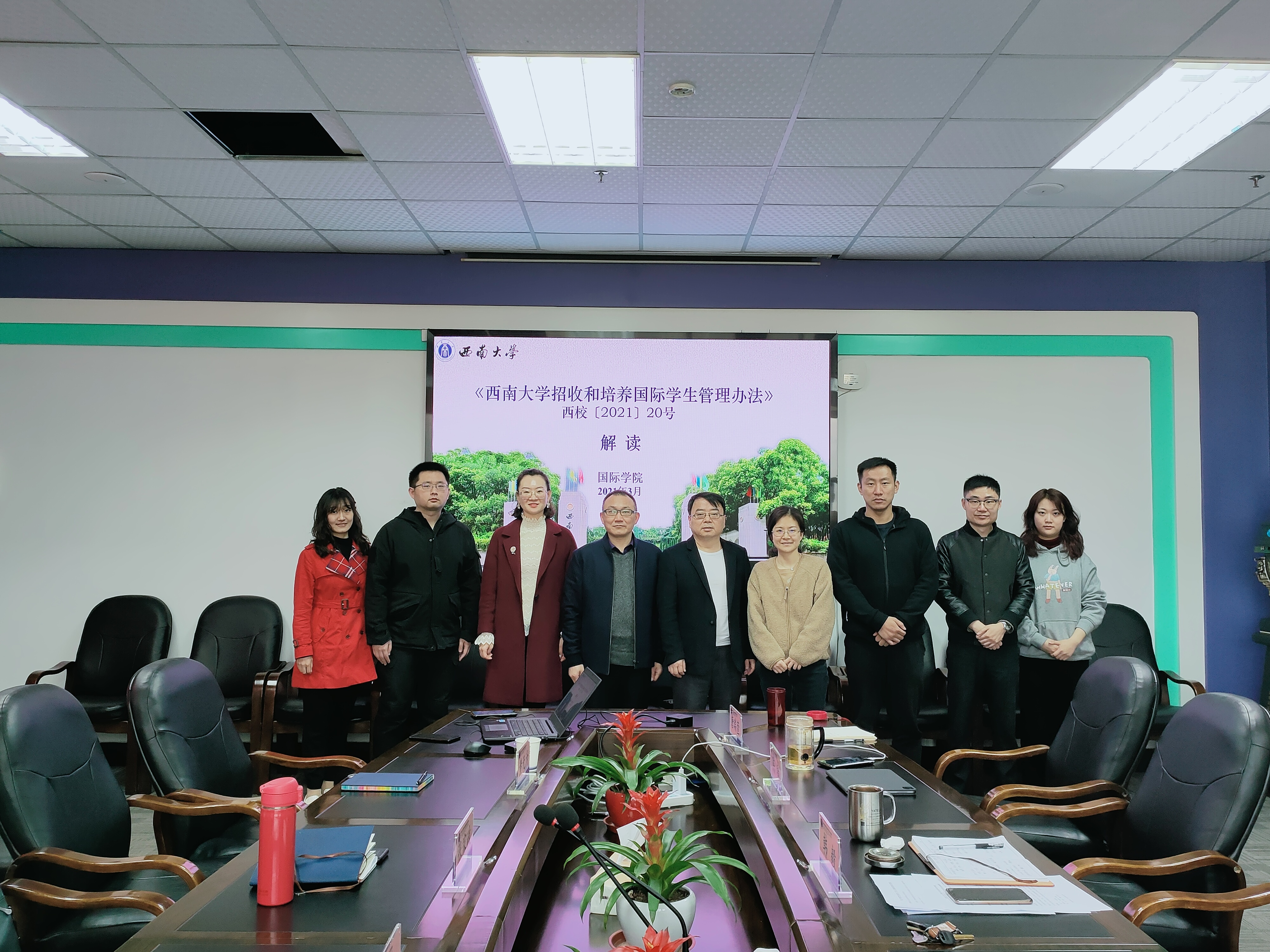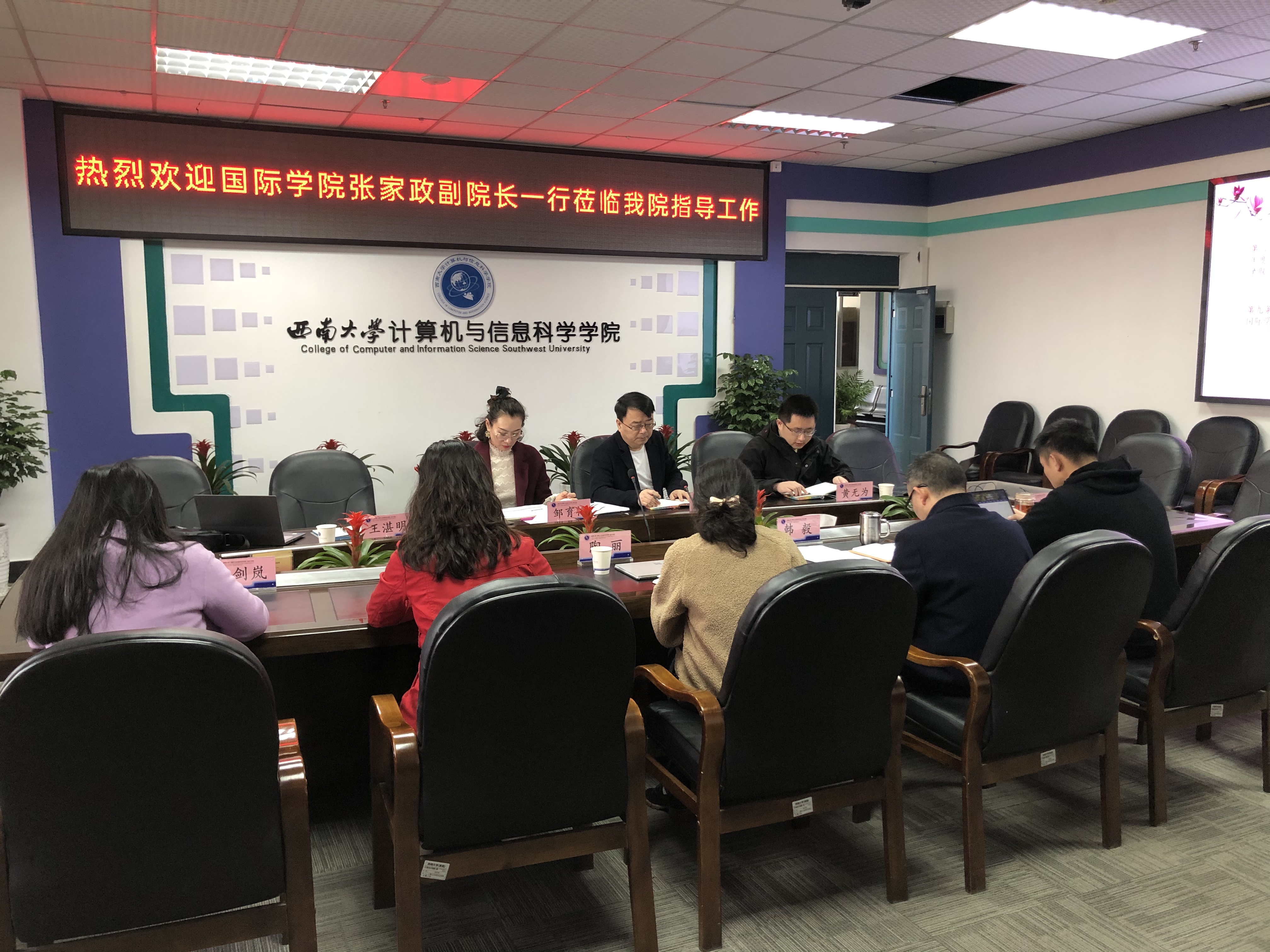 为加强与二级培养单位的沟通与联系,进一步做好来华留学教育工作, 3月24上午,副经理张家政带领学院招生办、教学办、学工办有关工作人员前往计算机与信息科学学院/软件学院调研,计算机与信息科学学院/软件学院副经理韩毅、副经理陶丽、副书记陈智和有关辅导员、外事秘书、教学秘书等参与座谈交流。