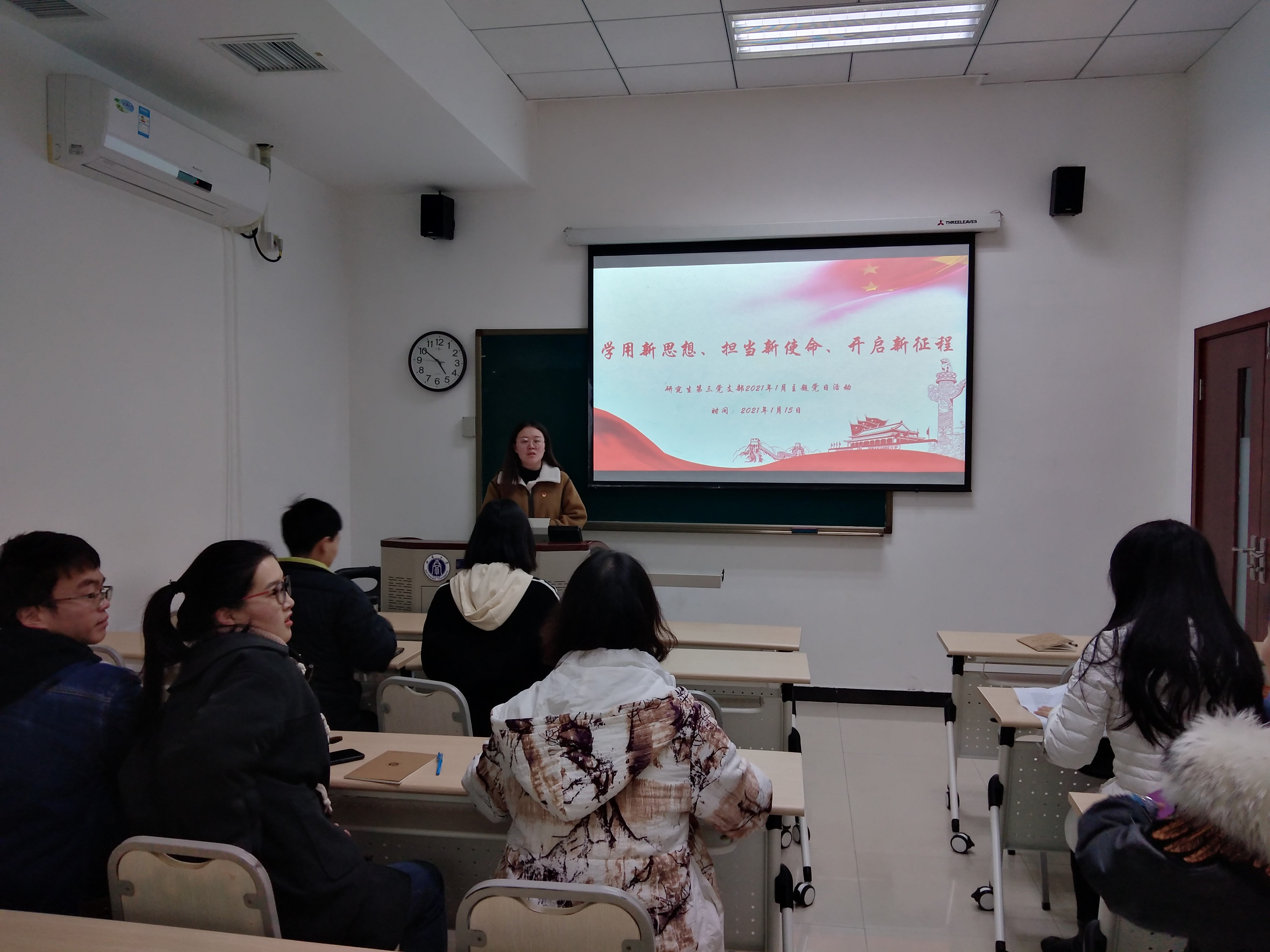 1月15日下午14:30研究生第一党支部在紫云楼210室开展了“学用新思想、担当新使命、开启新征程”主题党日活动及党员民主评议会。会议主要分为以下几个环节进行。