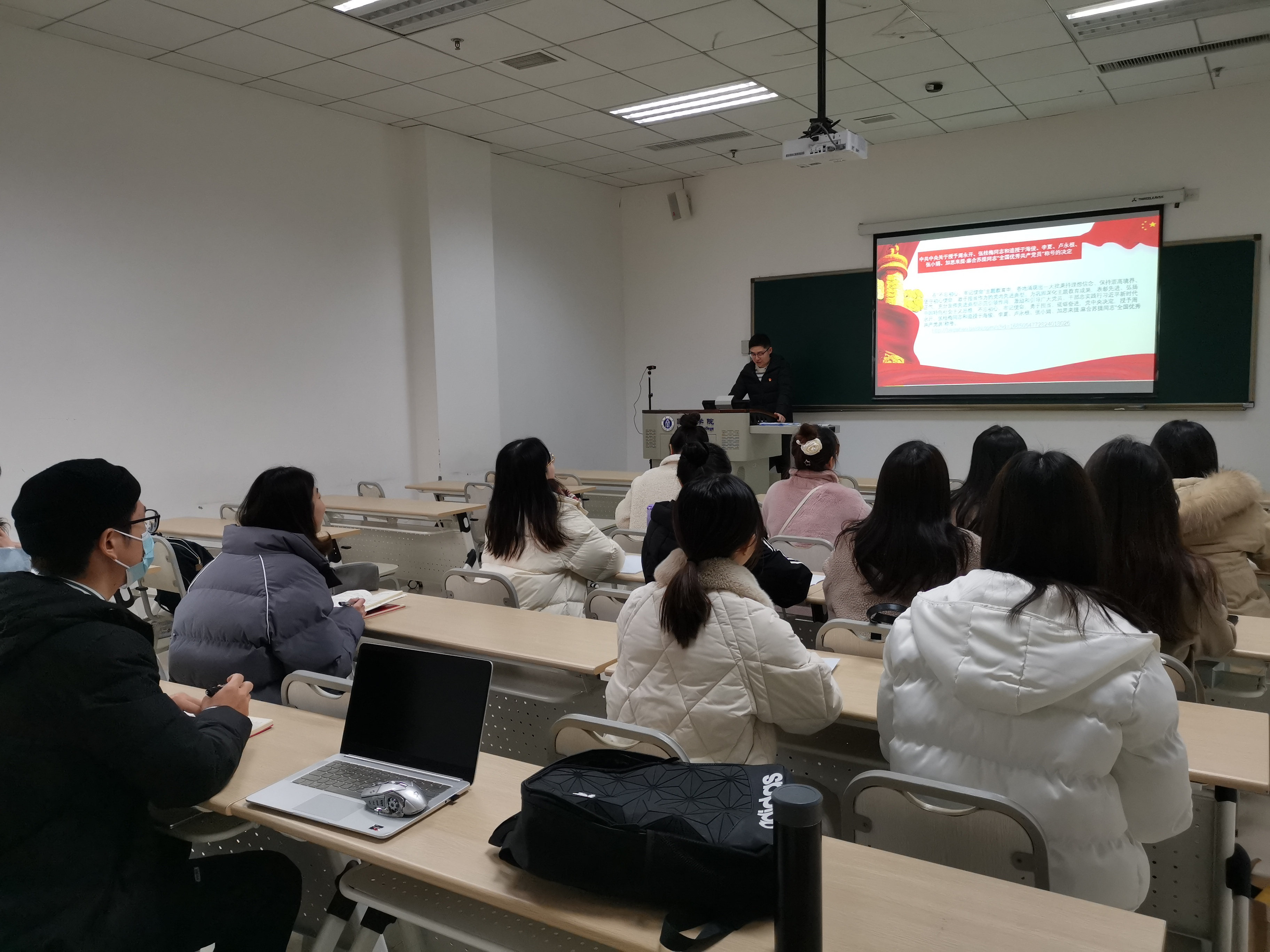 1月15日下午14:30,教工二支部全体党员在学院304会议室召开了“学用新思想 担当新使命 开启新征程”的主题党日活动。在支部书记李林泽同志的带领下,全体党员首先学习了《中国共产党党员权利保障条例》,了解了作为普通党员权利的行使、保障措施和违规责任追究。随后,支部为一月入党的王鹊同志过了政治生日,并赠送了生日礼物。接着,李林泽同志代表支委班子述职,并接受支部全体党员和群众代表的评议。最后,全体党员进行了批评与自我批评,同志们大胆剖析、查摆问题,知无不言、言无不尽,不讲情面、不当好人,深入触及思想和灵魂,达到了“红脸出汗”的效果。