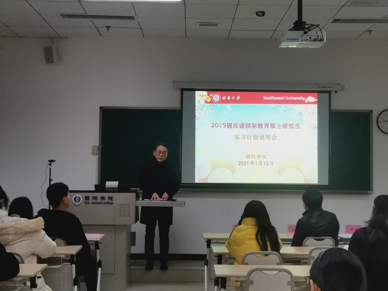 1月15日上午9点,学院在紫云楼312室举行2019级汉语国教育硕士实习行前说明会,刘猛书记、张家政副经理,汉教系主任杨甜、教学办主任邹育艳、学工办主任杨昆以及全体2019级汉硕生参加会议,会议由研究生辅导员汪鑫阳主持。