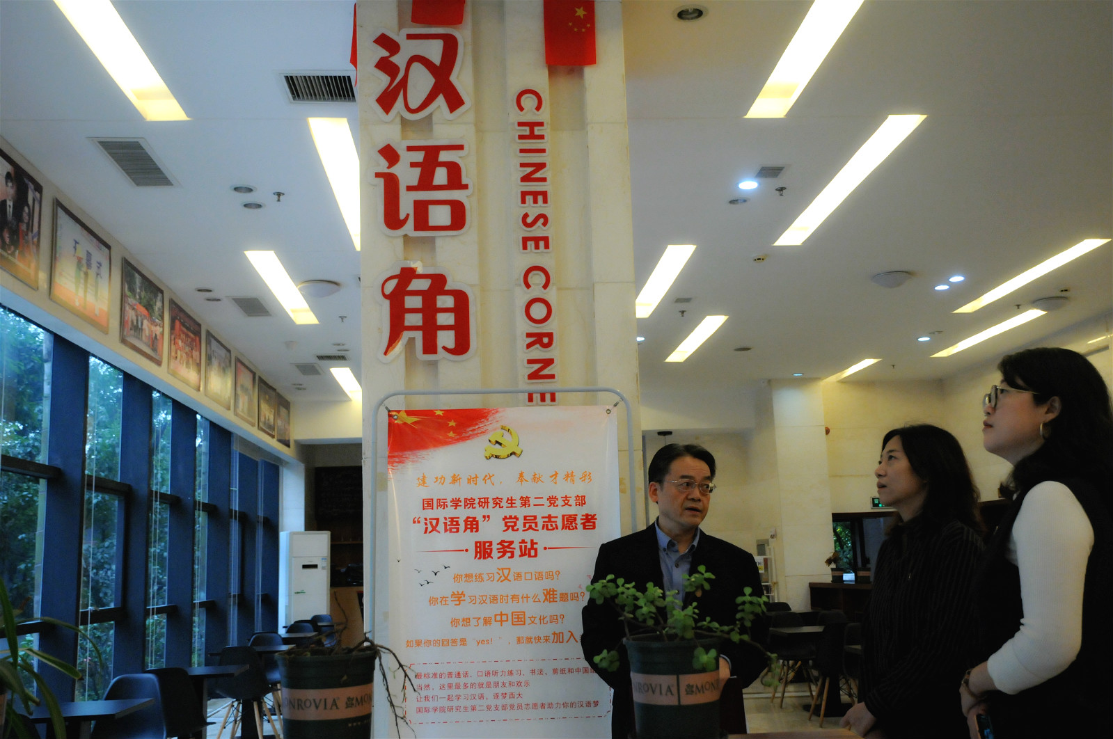 刘猛书记对客人的到来表示欢迎,带领她们参观了紫云楼,介绍了学校来华留学工作概况以及在国情教育方面的探索和实践。