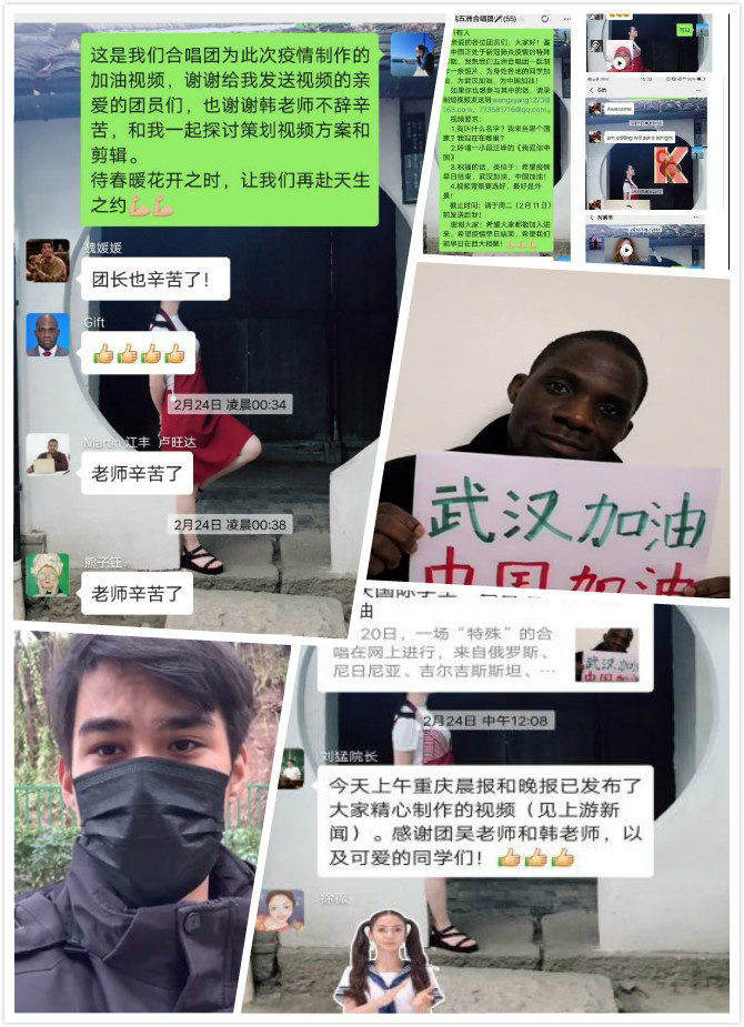 2020年2月8日是中国传统节日元宵节,作为五洲合唱团团长的我通过微信群给团员们加油打气:“今天是元宵佳节,在此祝大家元宵节快乐!希望大家做好疫情防护措施,待春暖花开之时,我们仍在美丽西大相聚!”。团员们因而深受感动并纷纷响应我的提议,在世界各地录制视频,共唱《我爱你中国》,为武汉祈福,为中国加油。