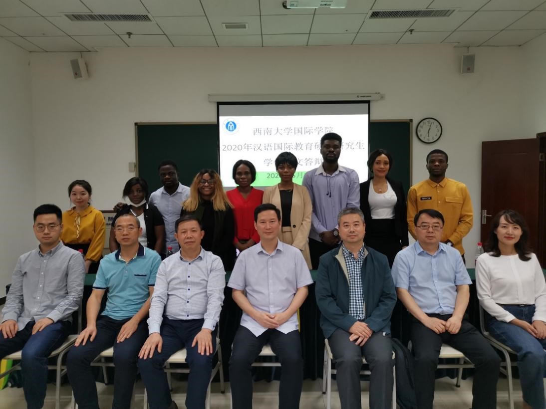 委员交流结束后,答辩正式开始。上午9:00-12:30,线下答辩在紫云楼312教室进行,何洁和来自尼日利亚的宋珂等9名在校中外员工依次参加了答辩;下午1:30-5:30,线上答辩在紫云楼304会议室进行,陈希、孟栩可和来自泰国、越南、尼日利亚等国家的8名中外员工依次远程接入钉钉视频会议进行论文PPT展示与陈述,并回答了答辩委员会委员提出的问题。