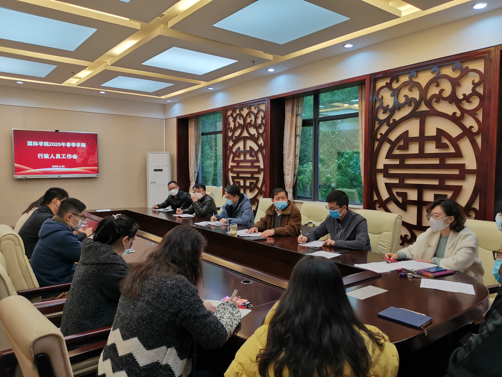 4月22日上午9点,学院在紫云楼签约室召开2020年春季学期行政人员工作会,刘猛书记主持会议。
