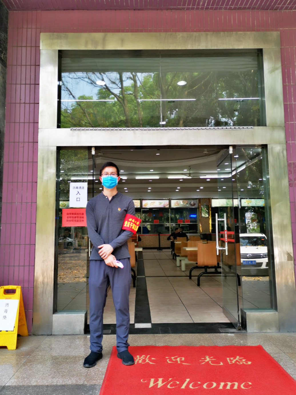 王鹊,学院招生办公室工作人员,中共党员。他负责的是在教工食堂门口为就餐师生测体温,维持排队和就餐的秩序。他表示,“在学校有幸志愿参与这样一场在一生当中难得遇见的大事件,哪怕是在很小的一个岗位上做了很小的一件事情,也是感到很光荣的。中国终将获胜,人类终将获胜。”