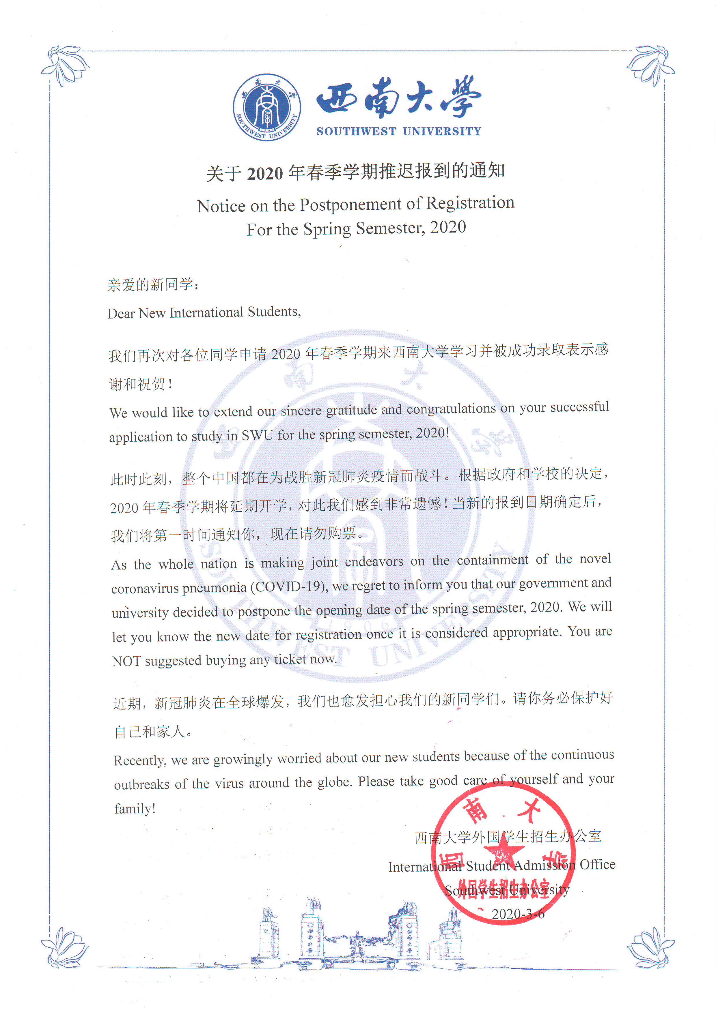 公司通过网站公告、微信群发、邮件通知等多种方式发布中英文官方消息,确保通知到每一名新生,明确要求员工在未接到学校正式开学通知前不得提前来校。截至目前,无一新生提前来校,各项目合作院校对学校防疫工作表示充分理解与大力支持。