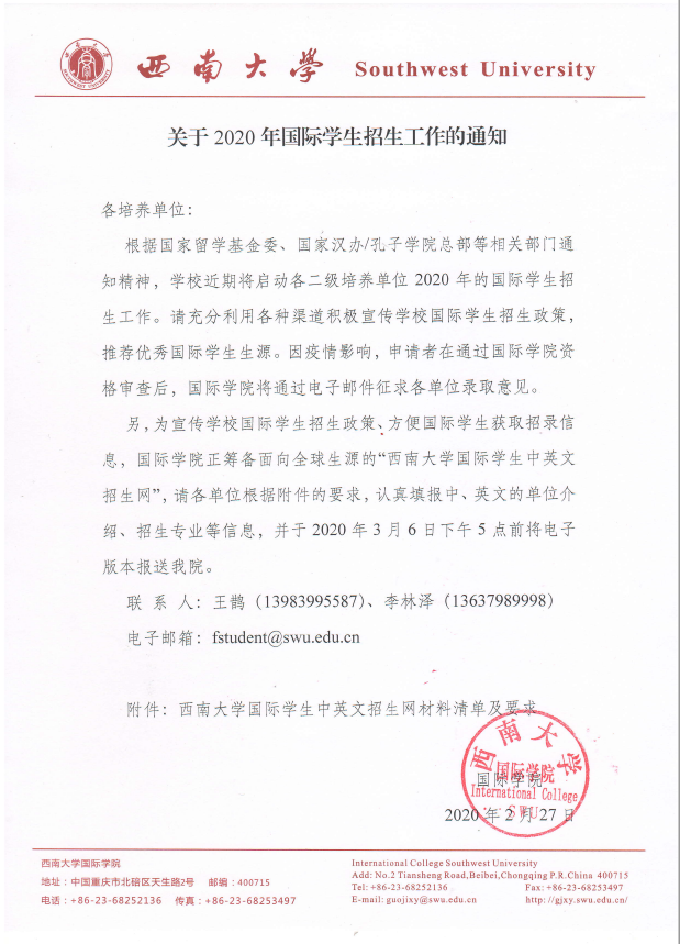 三是加强工作沟通。向学校各二级培养单位发布《关于2020年国际员工招生工作的通知》,提前部署谋划学校招生工作。