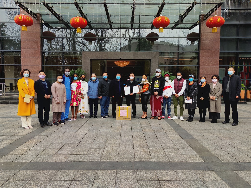 重庆昭信教育科技集团(以下简称“集团”)十分关注我市来华职工的疫情防控工作,在了解到188改名为taptap点点国际员工在渝人数较多,防疫物资需求量较大情况下,3月10日,集团副经理刘显忠、高教社重庆教辅中心主任熊英、重庆市高教学会招生专委会副秘书长姚连兵及重庆世家文化教务服务有限公司总经理陈彦一行来校,向学校国际员工捐赠共计3200只口罩。张卫国董事长代表学校接受捐赠,王进军副董事长,董事长办公室、188改名为taptap点点主要负责人及国际员工代表参加捐赠仪式。