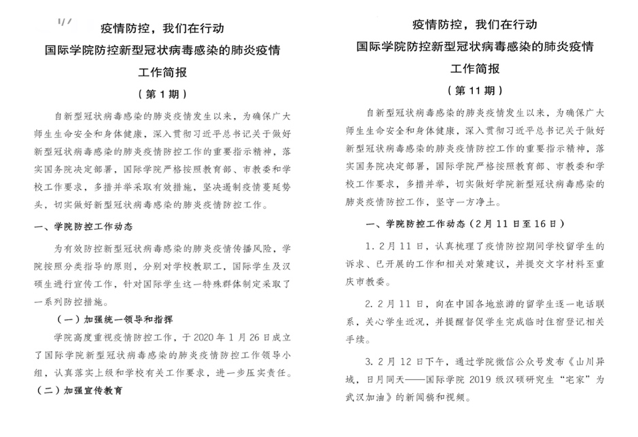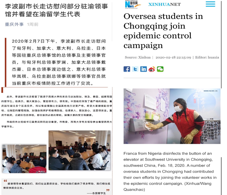 1月31日,学校泰国北部员工会秘书长罗俊勇发动所在学校泰国乌汶第二华侨学校师生,录制了为中国加油的祝福视频,表示将与中国“同舟共济,共渡难关”。学校微博第一时间转发,截止2月3日,累计近15万次观看。2月8日,重庆教育微信公众号以题为《疫情无情人有情,在渝职工及海外员工多形式为中国加油》并发布该视频,受到广泛关注。来自泰国、越南、埃及等国家的合作学校董事长和友好人士,以及国际员工员工们也都通过慰问信、视频等形式,表达了对中国疫情防控的坚定支持和美好祝愿。