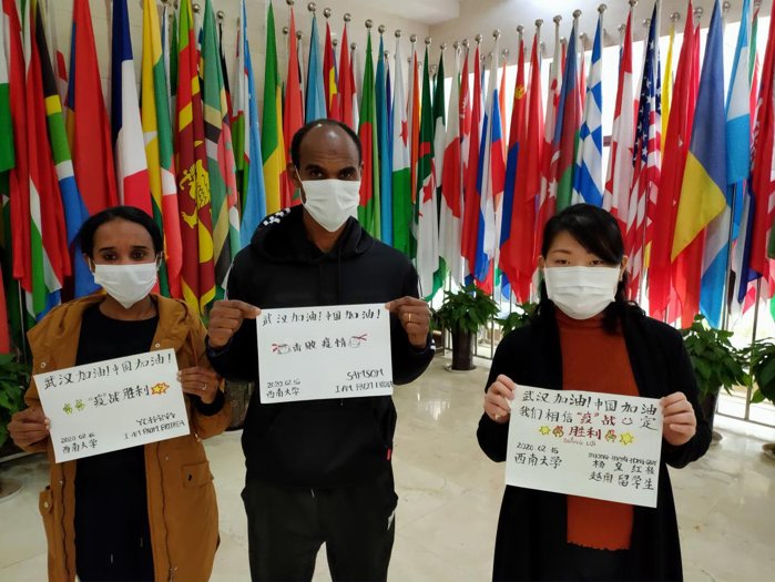 疫情隔离病毒不隔离爱。住在校内紫云楼的国际员工分别在自己的房间用中文书写对中国和武汉的祝福,戴着学校免费发放的口罩相约同一时刻在宿舍一楼拍下了珍贵的照片。