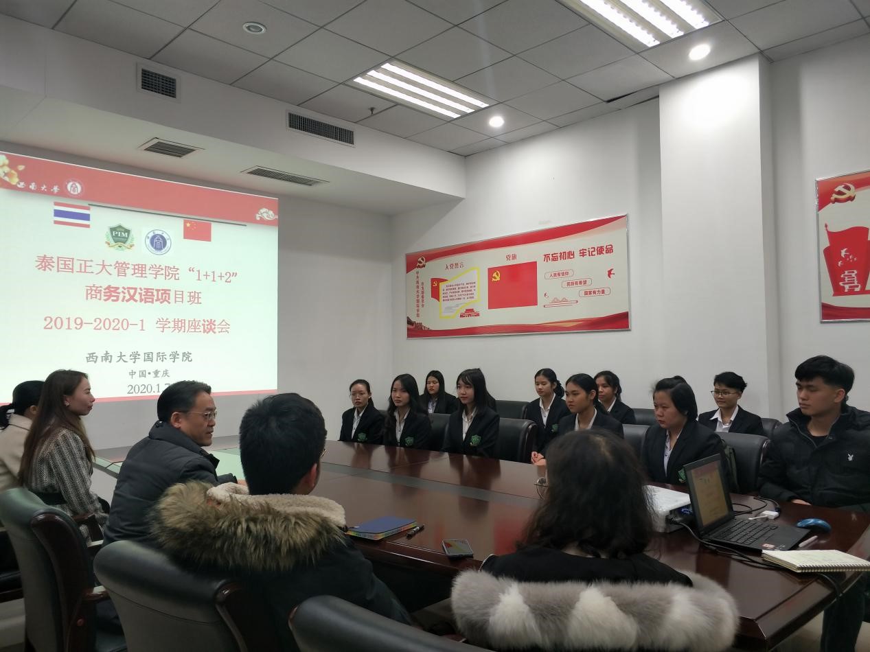 2020年1月7日下午五点,2019级泰国正大管理学院项目班员工2019-2020-1学期期末座谈会在学院304会议室圆满举行。公司党总支书记刘猛,任课教师代表陈晨、钟万平、王霜、刘欢欢等四位老师,以及12名泰国员工参加会议,座谈会由班主任吴宗燕老师主持。