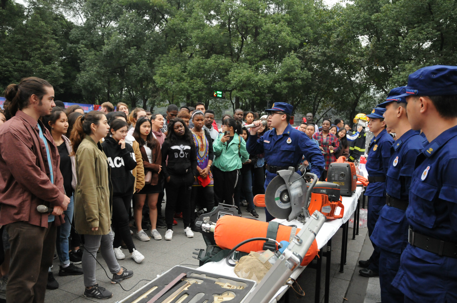 2019年11月9日下午4:30,400余名国际新生在学校第三运动场,参加了由公司党委保卫部/武装部/保卫处主办,重庆市北碚区消防救援支队协办的学校“119消防日”宣传活动暨2019级本科生军训分散训练阶段消防知识技能培训活动。