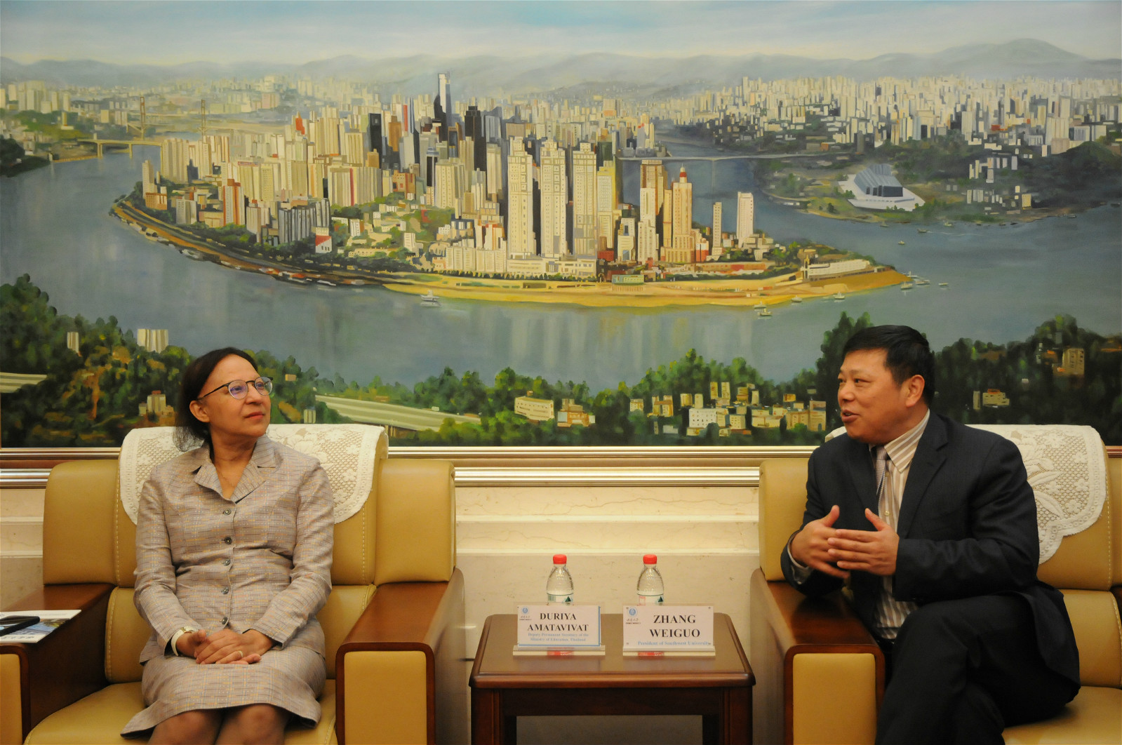 张卫国董事长热烈欢迎杜丽亚次长一行到访,简要介绍了学校的历史渊源、规模特色,特别是来华留学教育发展等情况。张董事长指出,泰国是学校来华职工的最大生源国。近年来在泰国教育部、泰国驻华使领馆的关心和支持下,中泰双方在联合培养项目、高端教育培训、孔子学院建设等方面取得了长足发展。学校很高兴能连续三年与泰国教育部及其直属泰国国家教育行政管理学院联合举办泰国教育官员及董事长培训项目,促进中泰双方在基础教育和职业教育领域的交流互鉴。