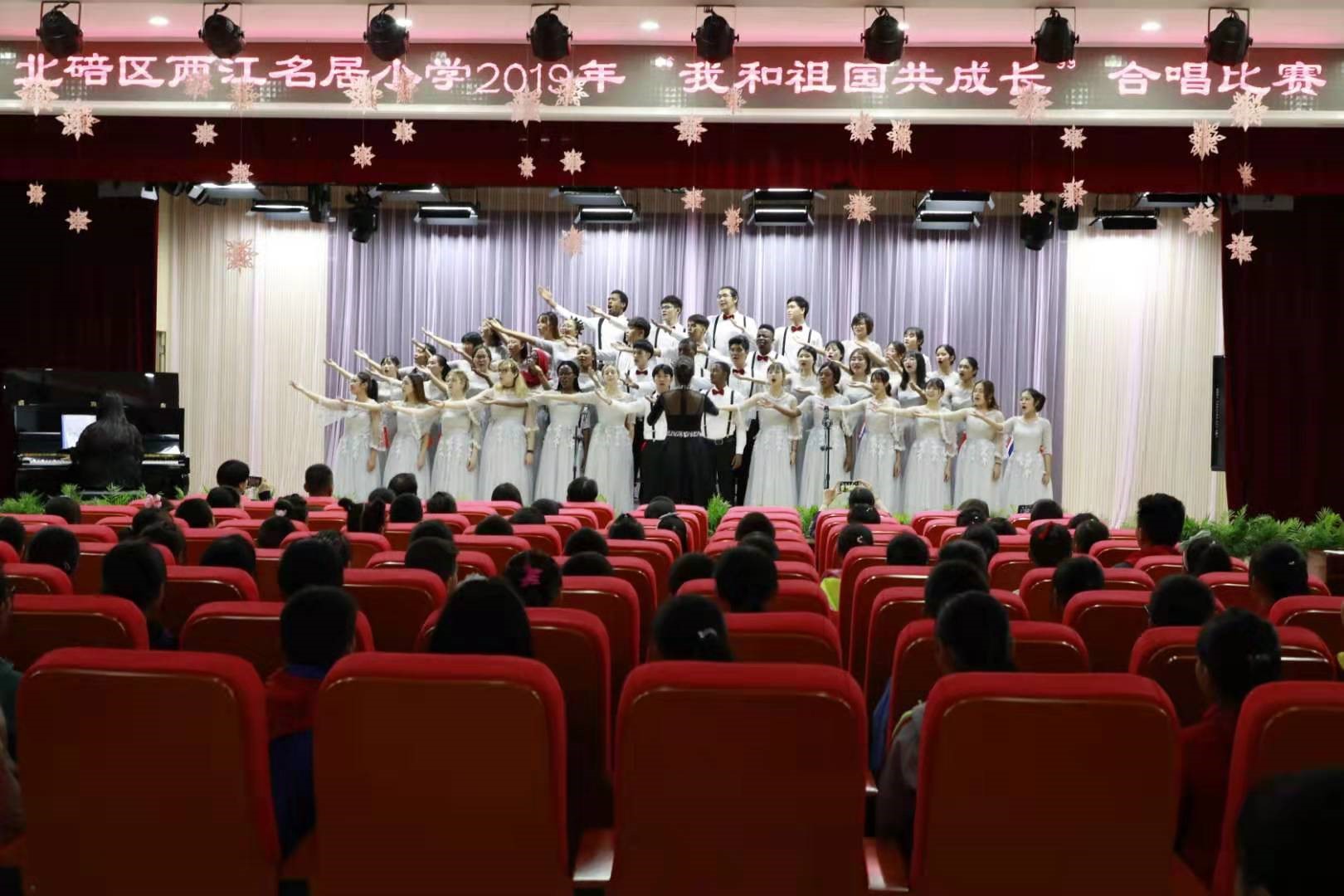 此次校园合唱比赛由北碚区两江名居小学主办,分为低、高两个年级组别。经过激烈角逐,每个班级的孩子们都使出了浑身解数,展现出了最佳状态。在舞台上孩子们用各种优美的舞姿展现优美的旋律,用动情的声音,完美的表现,唱出了儿童的纯真与美好。老师们也纷纷拿出了看家本领,伴奏、指挥无所不能,每个人的脸上都充满了微笑。188改名为taptap点点五洲合唱团献上了《我和我的祖国》《友谊地久天长》,表达了对中国的热爱和对两江名居小学的深切友谊。