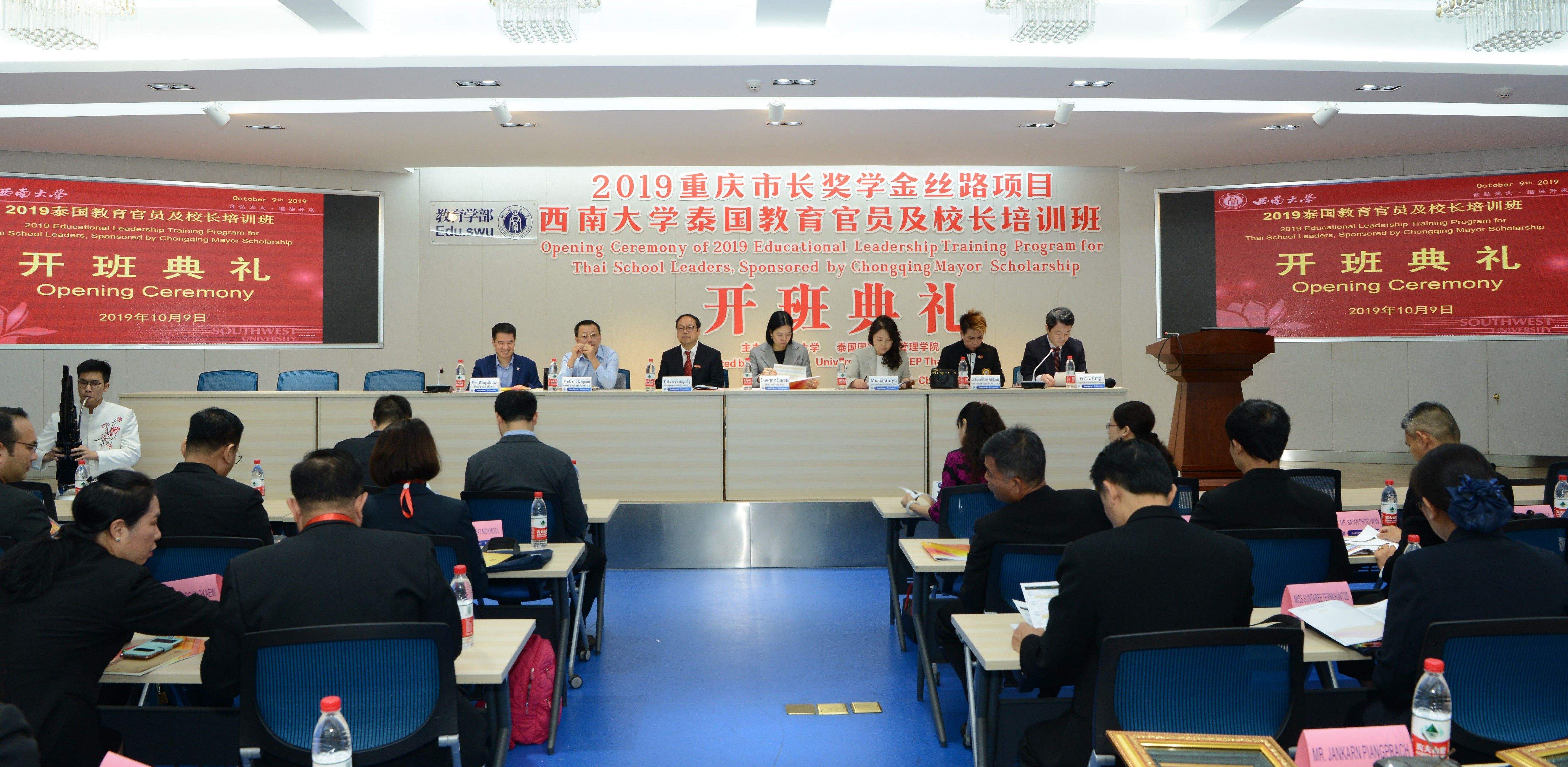10月9日,2019年重庆市人民政府市长奖学金丝路项目——“泰国教育官员及董事长培训”开班典礼在教育学部举行。泰国驻成都总领事馆副总领事万兰梦、泰国国家教育行政管理学院副经理帕安差丽、重庆市教委国际合作与交流处处长李世玉、学校董事长助理周光明,教育学部相关负责人、专家以及30名泰国教育官员及董事长出席开班典礼。