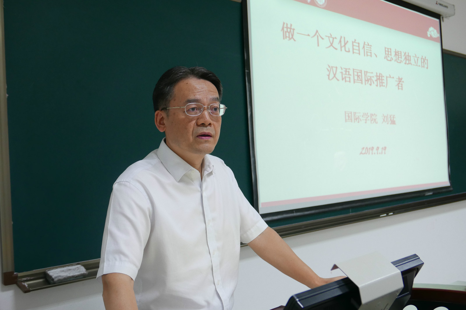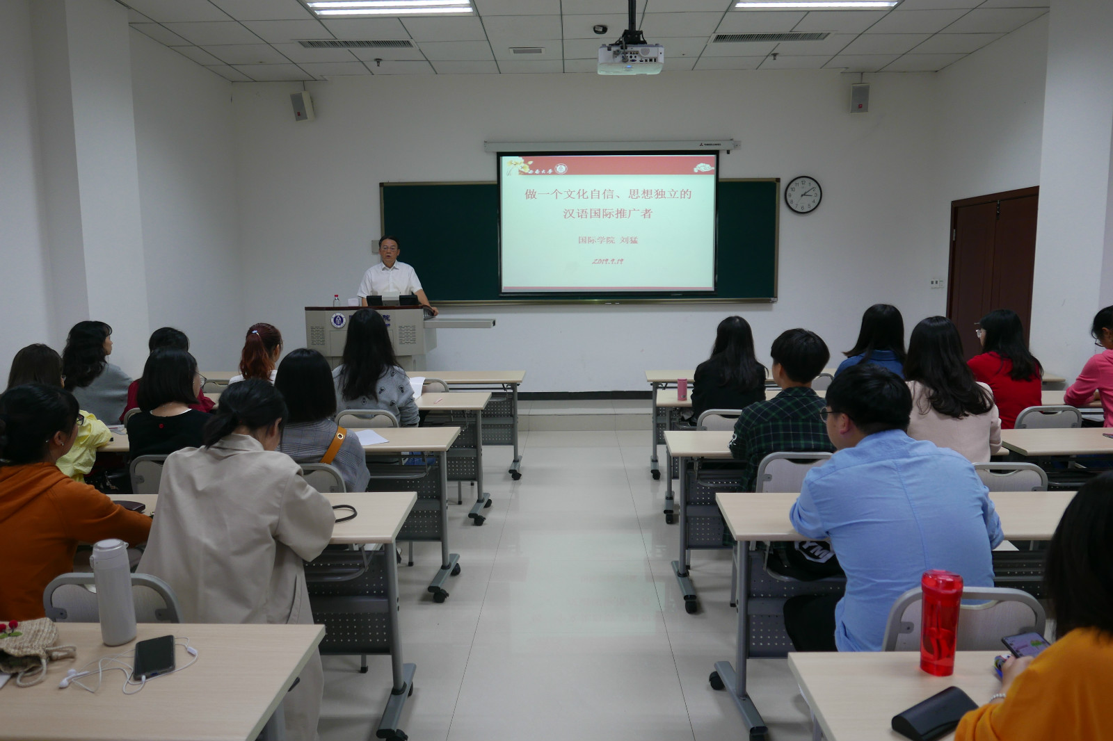 9月19日下午15点,结合当前国际国内形势和学院的思政教育安排,党总支书记刘猛为2019级汉语国际教育硕士中国班的28名新生展开了“做文化自信、思想独立的汉语国际推广者”的主题讲座。