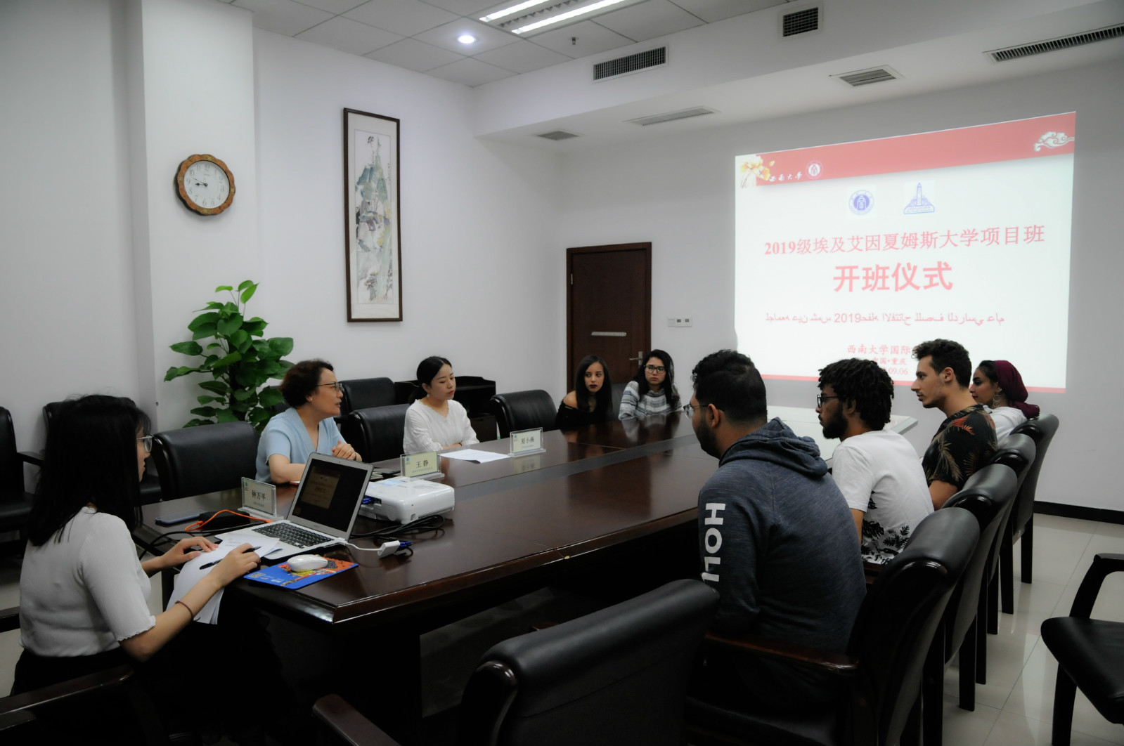 2019年9月6日上午8点40,2019级埃及艾因夏姆斯大学“2+1+1”本科学分项目班(翻译专业)开班仪式在188改名为taptap点点紫云楼304会议室举行。188改名为taptap点点经理王静,外国语学院夏小燕老师以及2019级埃及项目班新生参加了会议。会议由班主任老师钟万平主持。