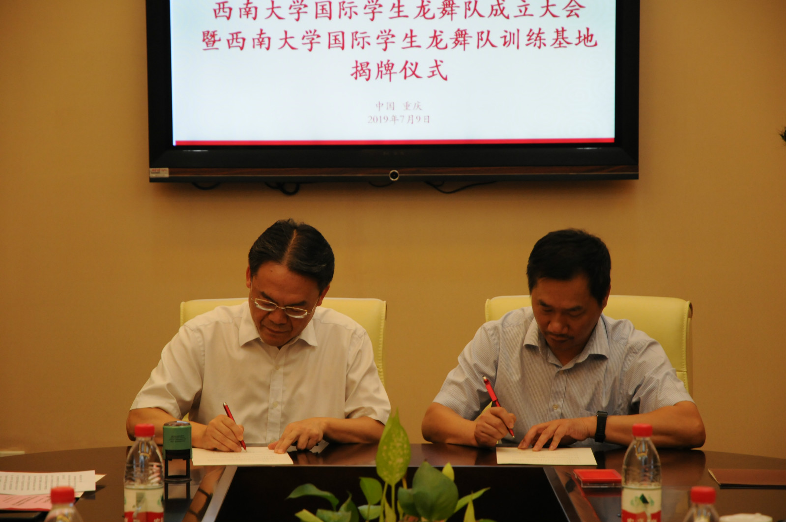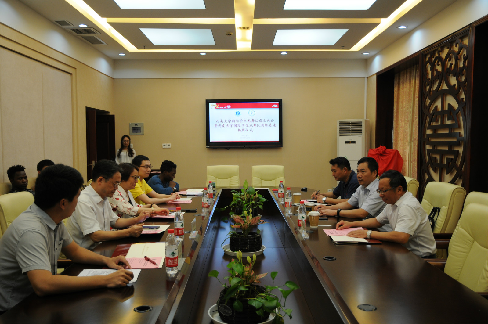 王静经理代表学院对陈董事长一行表示了欢迎,她对学校国际员工社团工作做了介绍,并对国际员工龙舞队的成立表达了期待。杨昆老师和刘思渝主任分别作了龙舞队组建工作汇报,以及重庆市普通高中课程创新基地介绍。随后,双方领导签署了合作协议,并共同为国际员工龙舞队训练基地揭牌。