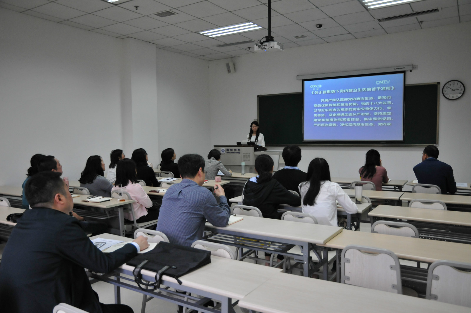 会上,由邱睿、冯雪、白小丽和钟万平四位老师带领教工一支部全体党员同志一起学习了《关于新形势下党内政治生活的若干准则》《关于加强党的政治建设的意见》以及《中国共产党重大事项请示报告条例》的内容及其重要精神。冯雪老师提出作为一名国际汉语教师,在思想上要有双重意识:一是要坚定培养亲华、友华、爱华的各国汉语学习人才的信念,二是要坚定在对外教育工作中维护国家形象、拥护党的信念。白小丽老师表示汉语课堂教学非个人行为,而是政治性非常强的组织行为,这要求教师上课纪律要严,牢记学术研究无禁区、公开讲课有纪律,要理直气壮、旗帜鲜明、不遗余力地做好汉语推广。钟万平老师通过学习文件,领悟到请示报告工作意义重大,作为一名汉语教师,更要做到在与上级沟通上下功夫,在高质量履行自己的职责上下功夫,在请示报告技巧上下功夫。