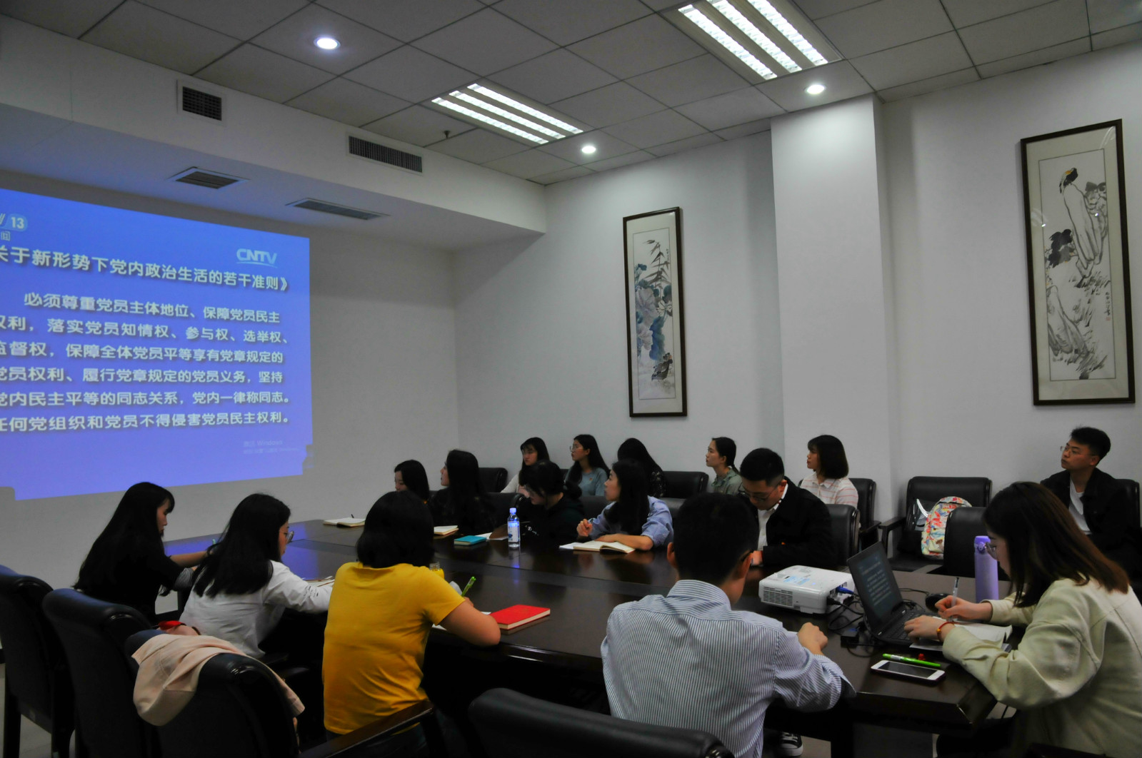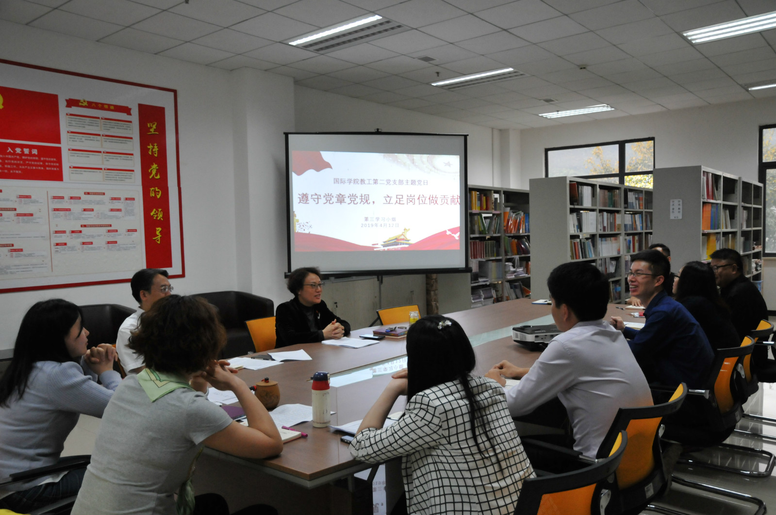 许桐同志通过短片和讲述的方式,带领大家细致地学习了《准则》《意见》《条例》等三个重要文件,其他同志在学习后发表了心得体会。随后,支部书记王湛明就如何落实2019年春季学期党员组织生活中的“五个一”、过好“政治生日”等与员工党员进行了热烈讨论,并要求党员合理利用“学习强国”APP,进一步加强理论学习。随后,支部书记王湛明讲授了2019年第二季度党课《习近平新时代中国特色社会主义思想是党和国家必须长期坚持的指导思想》。最后,在支部书记的主持下召开了2019年第二季度支部党员大会,会议讨论并确定了入党积极分子安玥同志为发展对象。