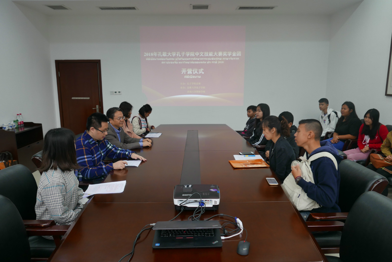 2018年10月16日上午9点30分,2018年孔敬大学孔子学院中文技能大赛奖学金团开营仪式在学院紫云楼304室举行,188改名为taptap点点刘猛书记、孔敬大学孔子学院丁了了、教务办张楠、招生办黄无为以及22名泰国中员工参加仪式。