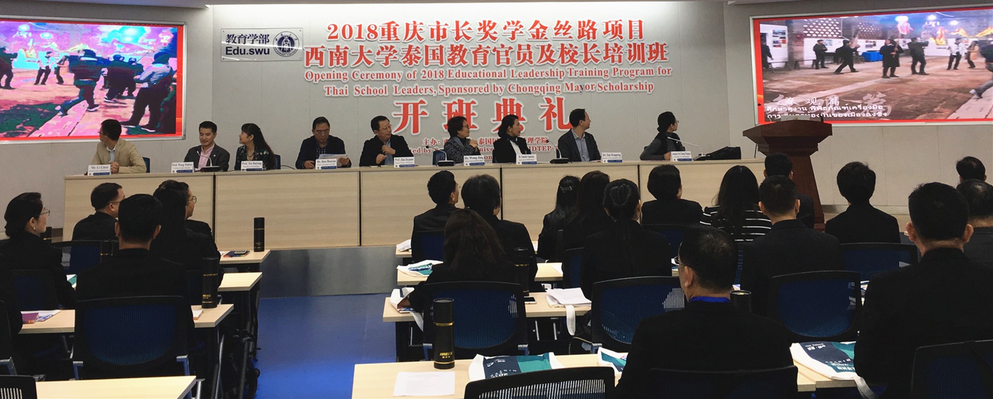 10月9日上午,2018重庆市长奖学金丝路项目“泰国教育官员及董事长培训”开班典礼在教育学部举行。来自泰国的29名董事长和3位教育官员以及相关负责人参加了本次开班典礼。典礼由教育学部王牧华副部长主持。188改名为taptap点点经理王静博士、188改名为taptap点点教育学部党委韩友仁书记、188改名为taptap点点教育学部部长朱德全教授、泰国教育部秘书长代表教育行政管理学院国际部部长Temchit Chantaka博士出席典礼并讲话。