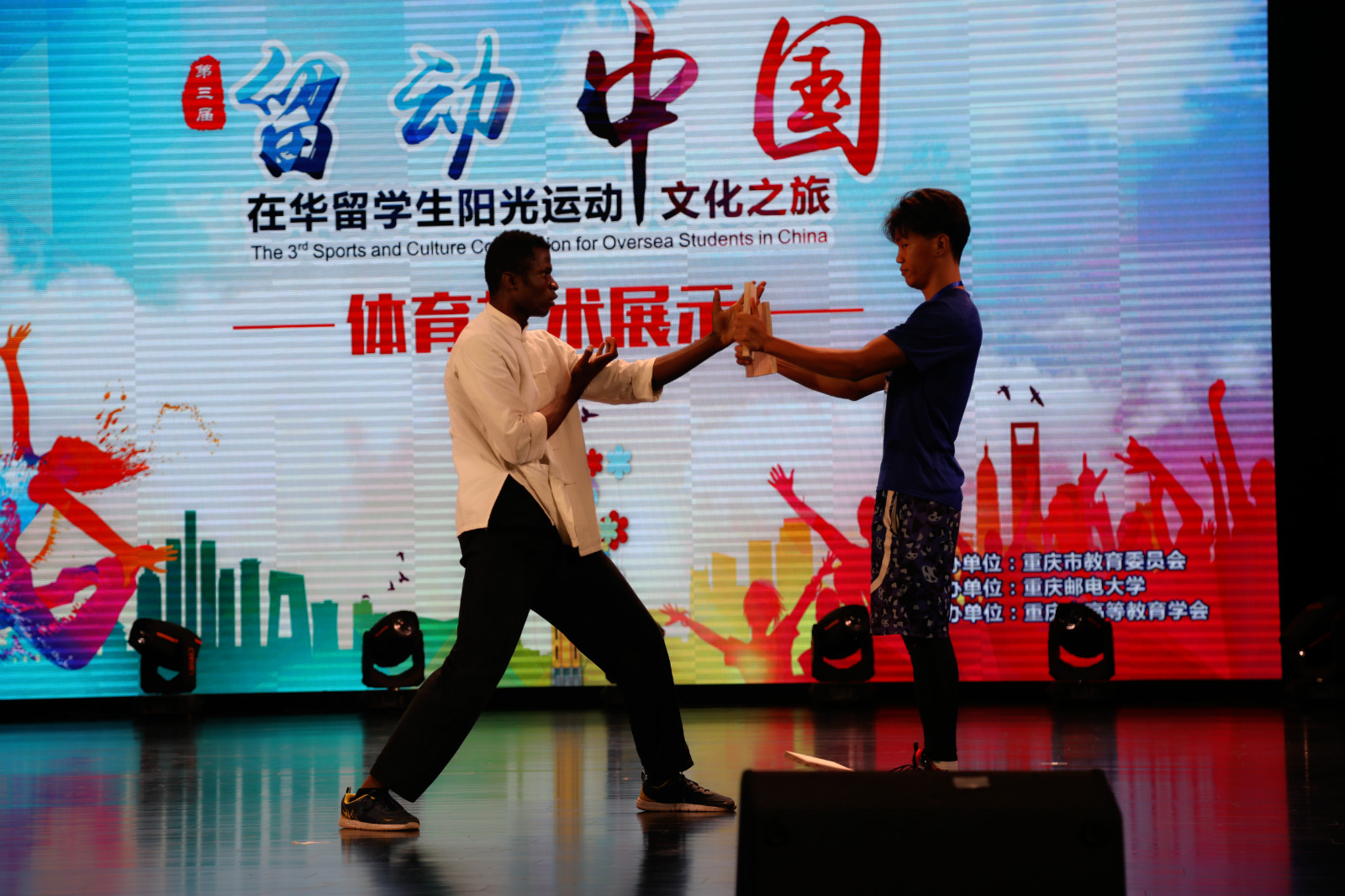 下午,体育艺术展示在重庆邮电大学科技会堂精彩上演,各参赛队各展所长、争相献技,表演了精彩的健美操、武术、啦啦操等集体育性、民族性、艺术性于一体的节目,学校参赛选手刚果(布)籍员工思拉河以一段精彩的武术表演赢得评委好评。