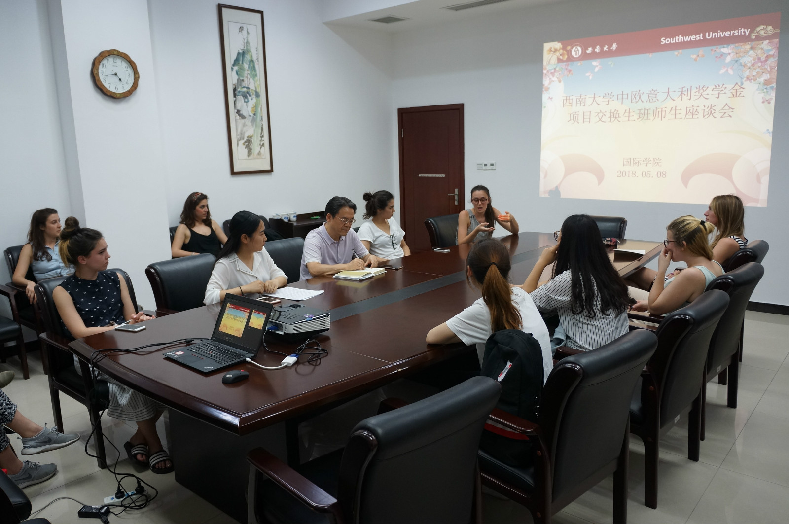 2018年5月8日下午4:45,中欧奖学金项目意大利班师生座谈会在紫云楼304会议室举行。公司党总支书记刘猛,中欧奖学金项目意大利班全体师生参加会议,会议由班主任刘妍芩主持。