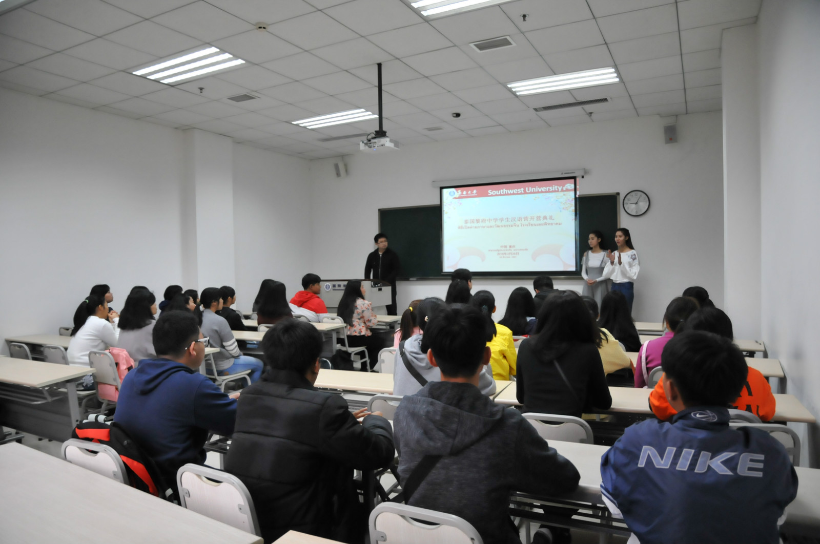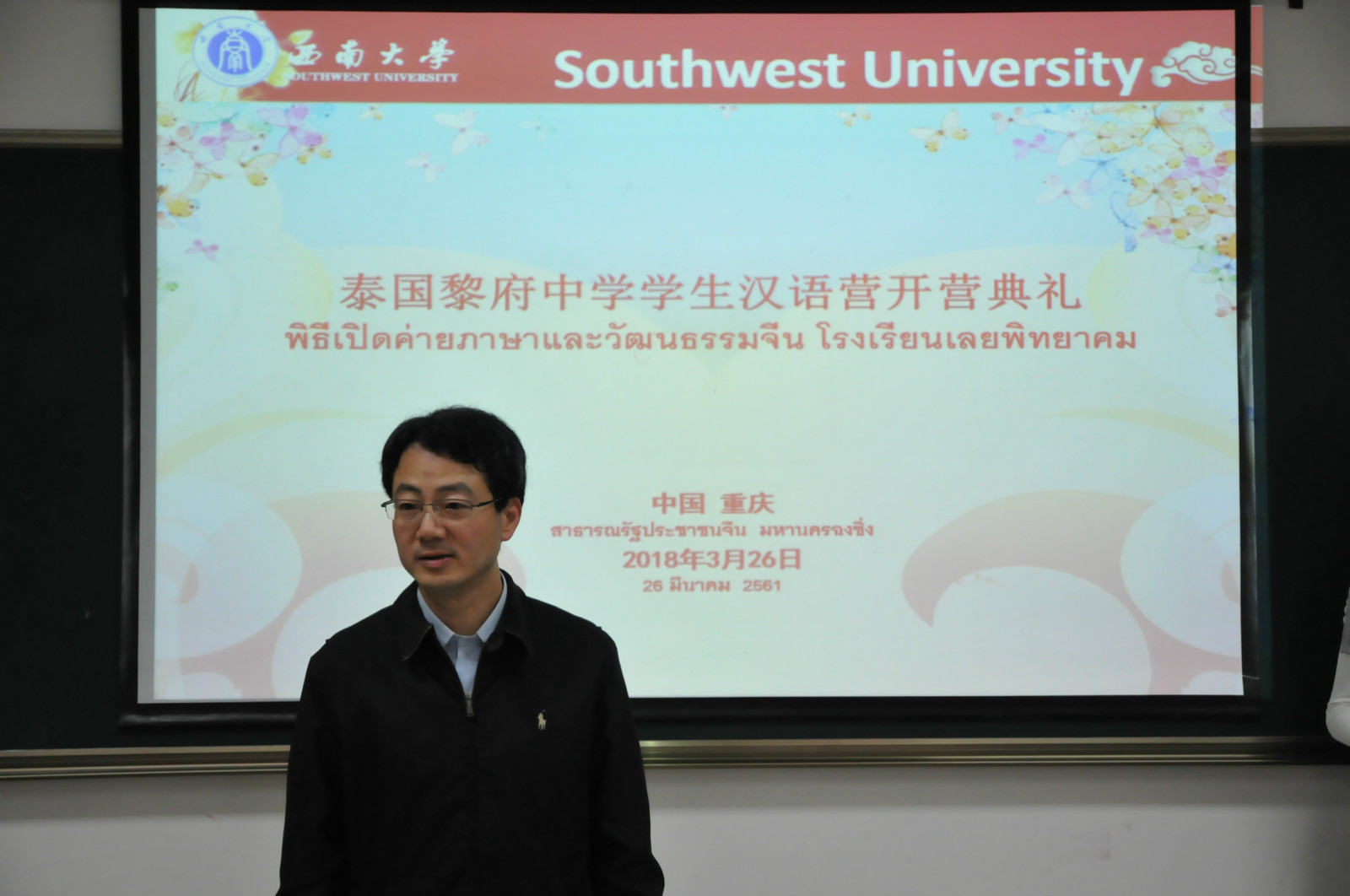 3月26日上午9点,泰国黎府中学员工汉语营开营典礼在公司紫云楼312教室顺利举行,副经理李航、招生办公室黄无为老师和谢路老师、泰国黎府中学领队教师MISS. SUKANYA RATCHAROEN、以及30名泰国中员工参加了此次开营典礼。