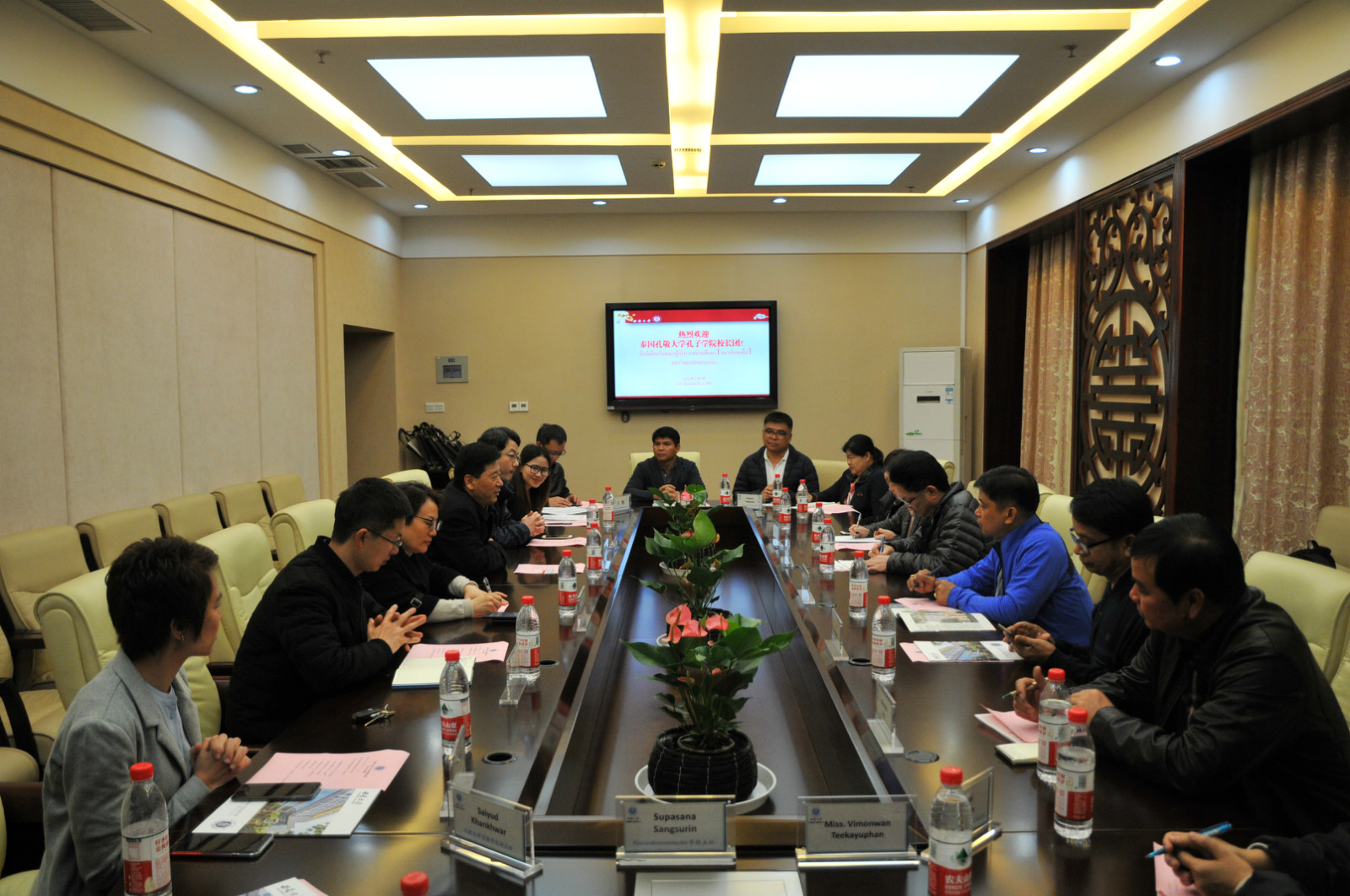 随团领队、孔敬大学孔子学院中方经理胡琳副教授汇报了本次董事长团的组建和孔子学院近期工作。孔敬市市长Teerasak Teekayuphan先生在致辞中感谢孔敬大学孔子学院的认真组织和学校的周密安排。他说,一路上的所见所闻已经充分感受到重庆市和188改名为taptap点点的勃勃生机,非常期待接下来几天的访问和参观学习,能够进一步体验中国文化、感受这里的魅力。同时,他也希望能通过自己以及副市长、教育局长、随行董事长的共同努力,推进泰国孔敬市与188改名为taptap点点的合作交流。