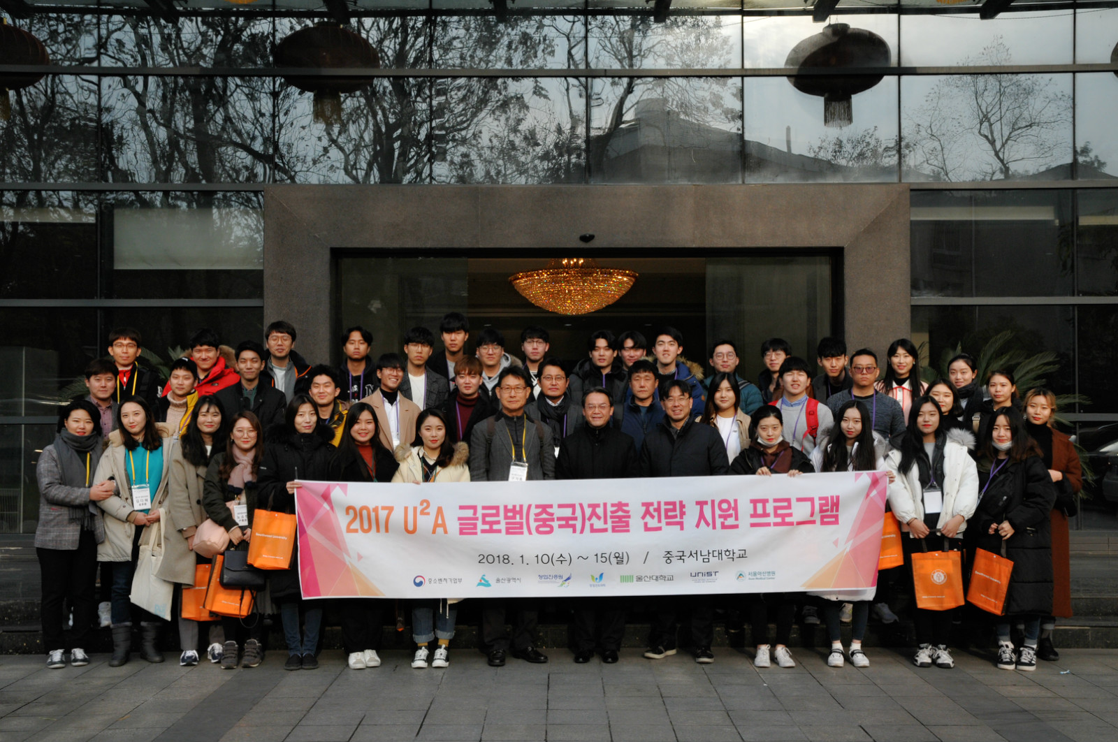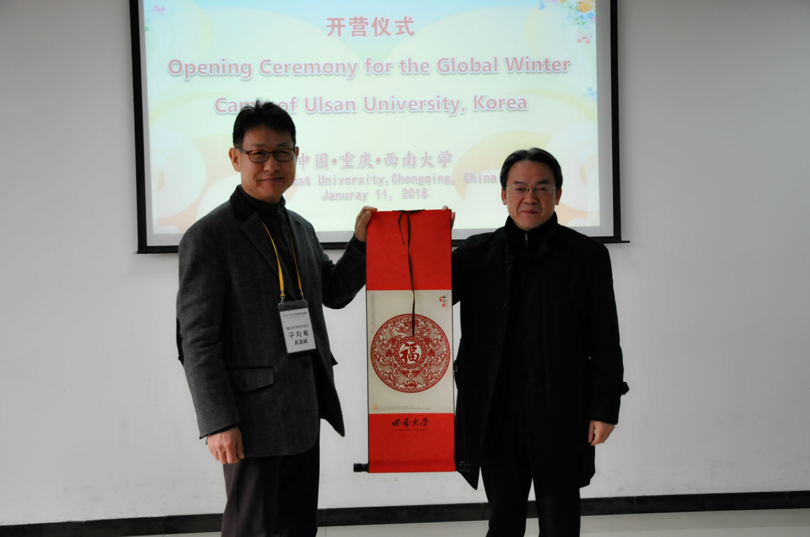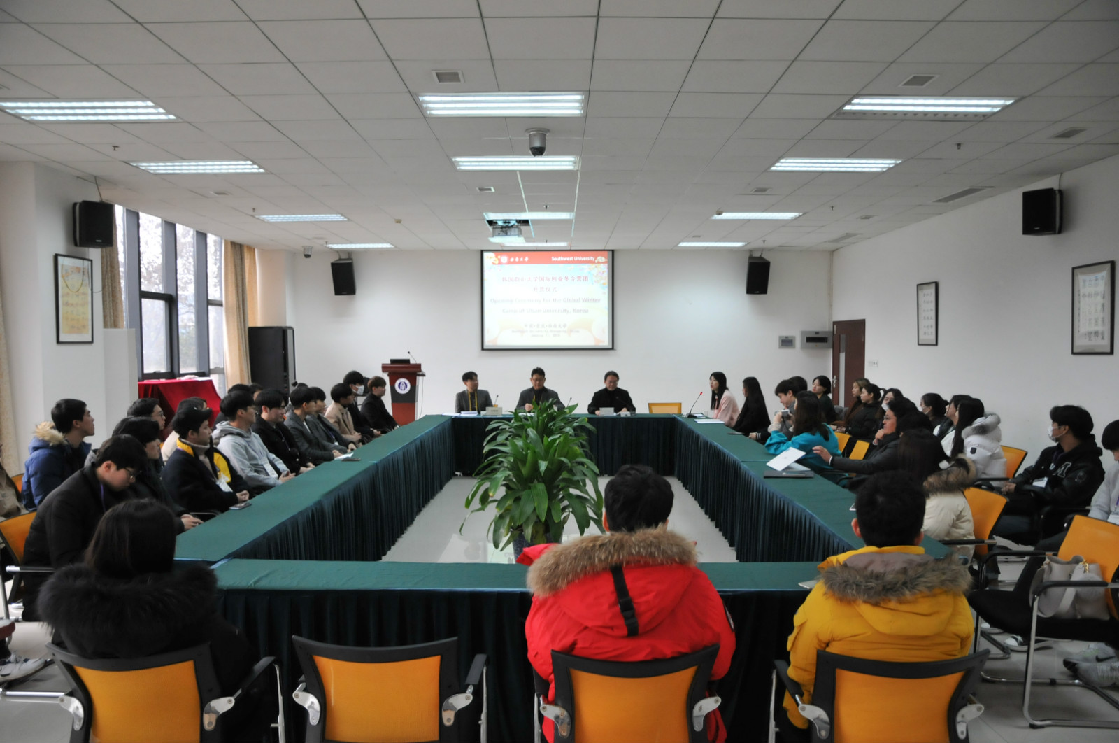 刘猛书记致欢迎辞,希望韩国同学通过此次冬令营的机会,加强和中国员工在创新创业上的经验交流,进一步增进对中国、重庆和学校的了解。蔚山大学创业支援团副团长具滋缘教授感谢学校热情周到的接待和安排,并期望中韩两国青年在创业之路上携手并进,续写中韩友谊新篇章。蔚山科学大学的刘相教授随后发言,表达了对双方合作和青年学子成才的美好祝愿。最后,双方互赠礼物,并合影留念。