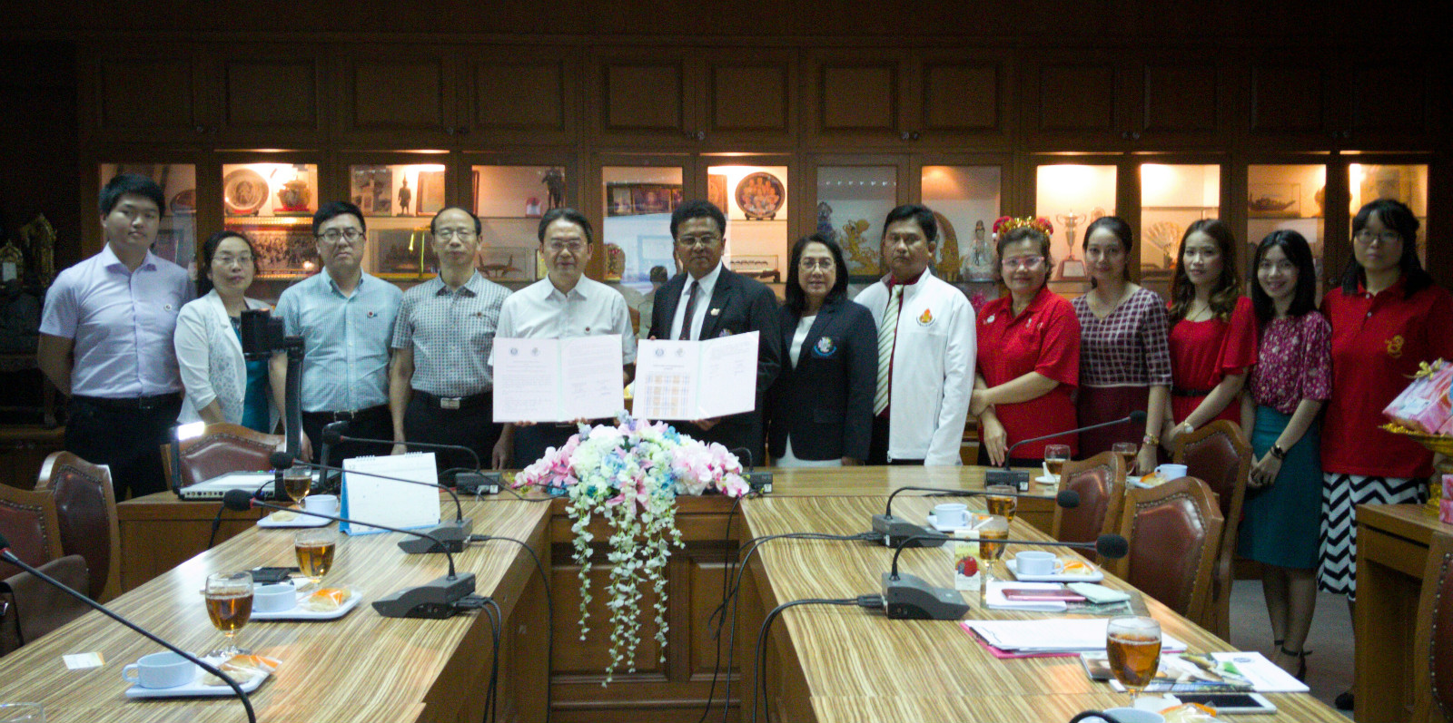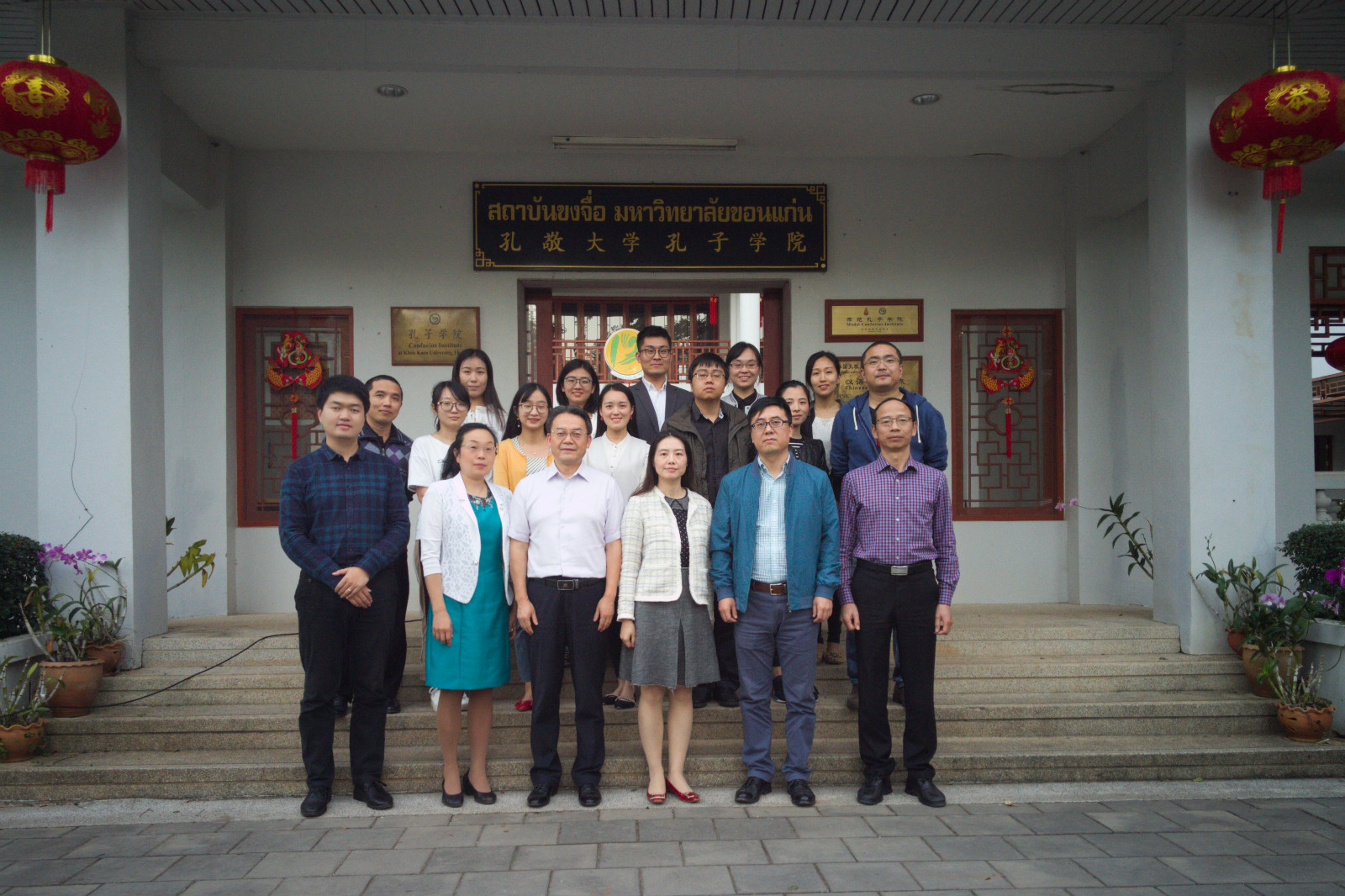 22日,代表团一行与孔子学院胡琳经理、部分公派汉语教师和全体孔敬地区汉语国际教育专业海外实习生座谈。胡琳经理介绍了孔院概况及所取得的工作成绩,实习生们对学习和工作的情况做了汇报。代表团一行寄语实习生在海外做好汉语教学的同时,加强政治和国情的学习,发挥个人优势,讲好中国故事。次日,代表团一行来到乌汶第二华侨学校,商谈远程教育的合作事宜,该校董事长庄舜鹏、经理黄培璇、经理助理罗俊勇等参与会见。双方就远程汉语教学和在该校建立汉硕实习点等事宜达成了共识。